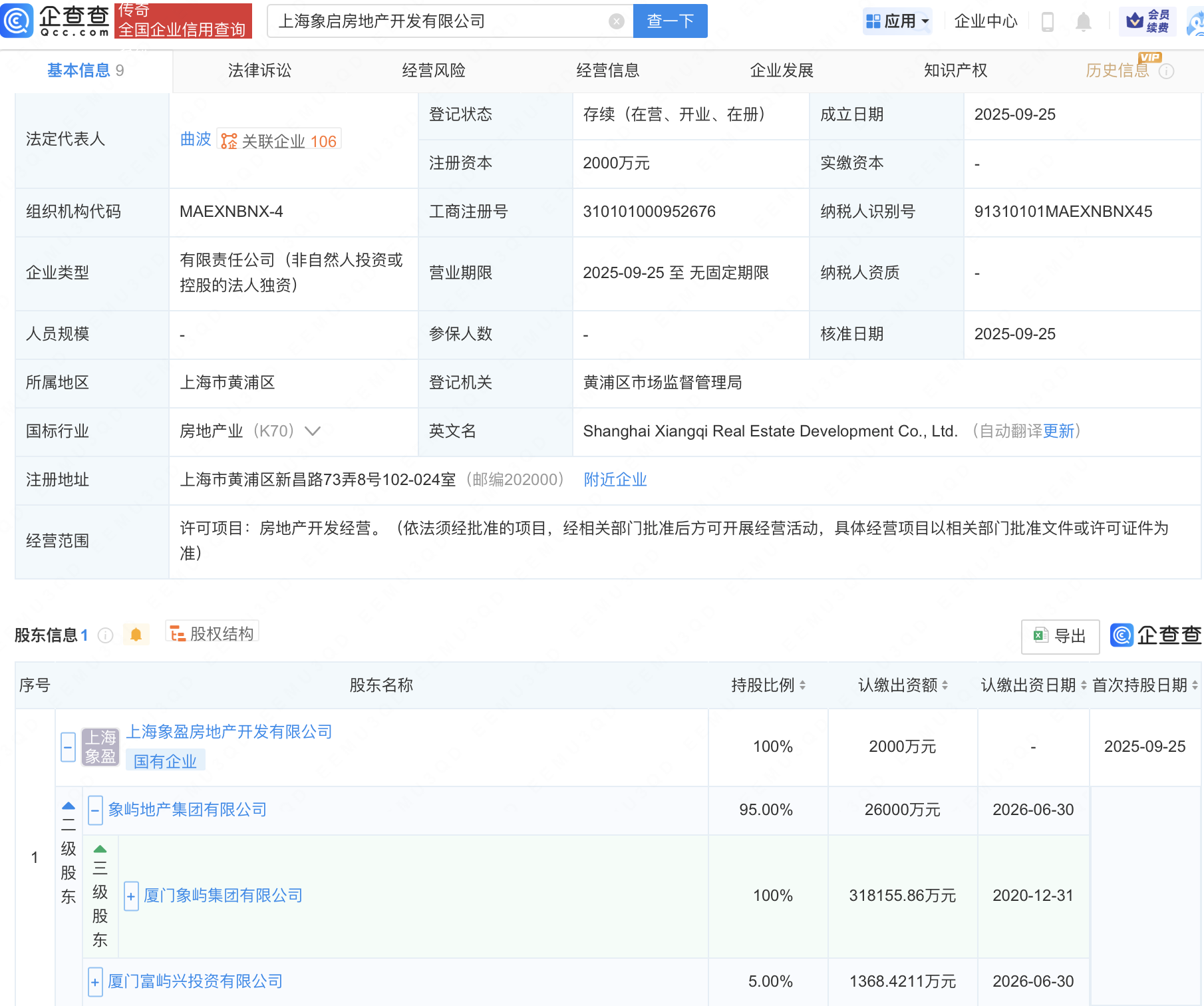 企查查APP显示,近日,上海象启房地产开发有限公司成立,注册资本2000万元,经营范围包含:房地产开发经营。企查查股权穿透显示,该公司由厦门象屿集团有限公司旗下上海象盈房地产开发有限公司全资持股。