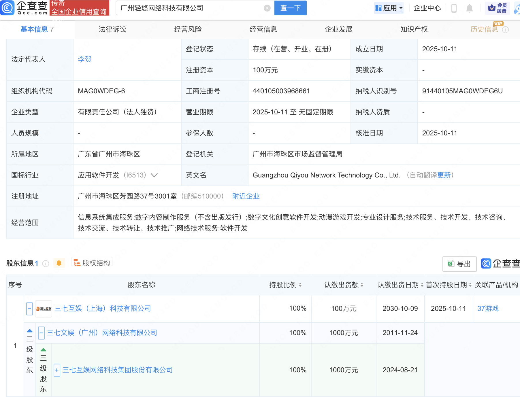 企查查APP显示,近日,广州轻悠网络科技有限公司成立,法定代表人为李贺,经营范围包含:数字文化创意软件开发;动漫游戏开发;专业设计服务等。企查查股权穿透显示,该公司由三七互娱(002555)间接全资持股。