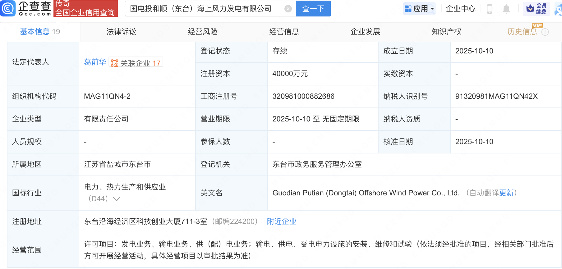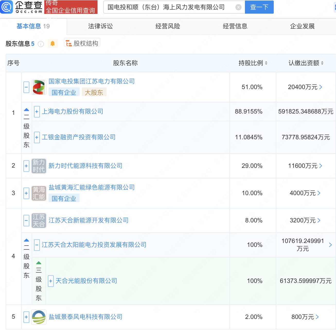 企查查APP显示,近日,国电投和顺(东台)海上风力发电有限公司成立,注册资本4亿元,经营范围包含:发电业务、输电业务、供(配)电业务;输电、供电、受电电力设施的安装、维修和试验。企查查股权穿透显示,该公司由上海电力(600021)旗下国家电投集团江苏电力有限公司、天合光能(688599)旗下江苏天合新能源开发有限公司等共同持股。