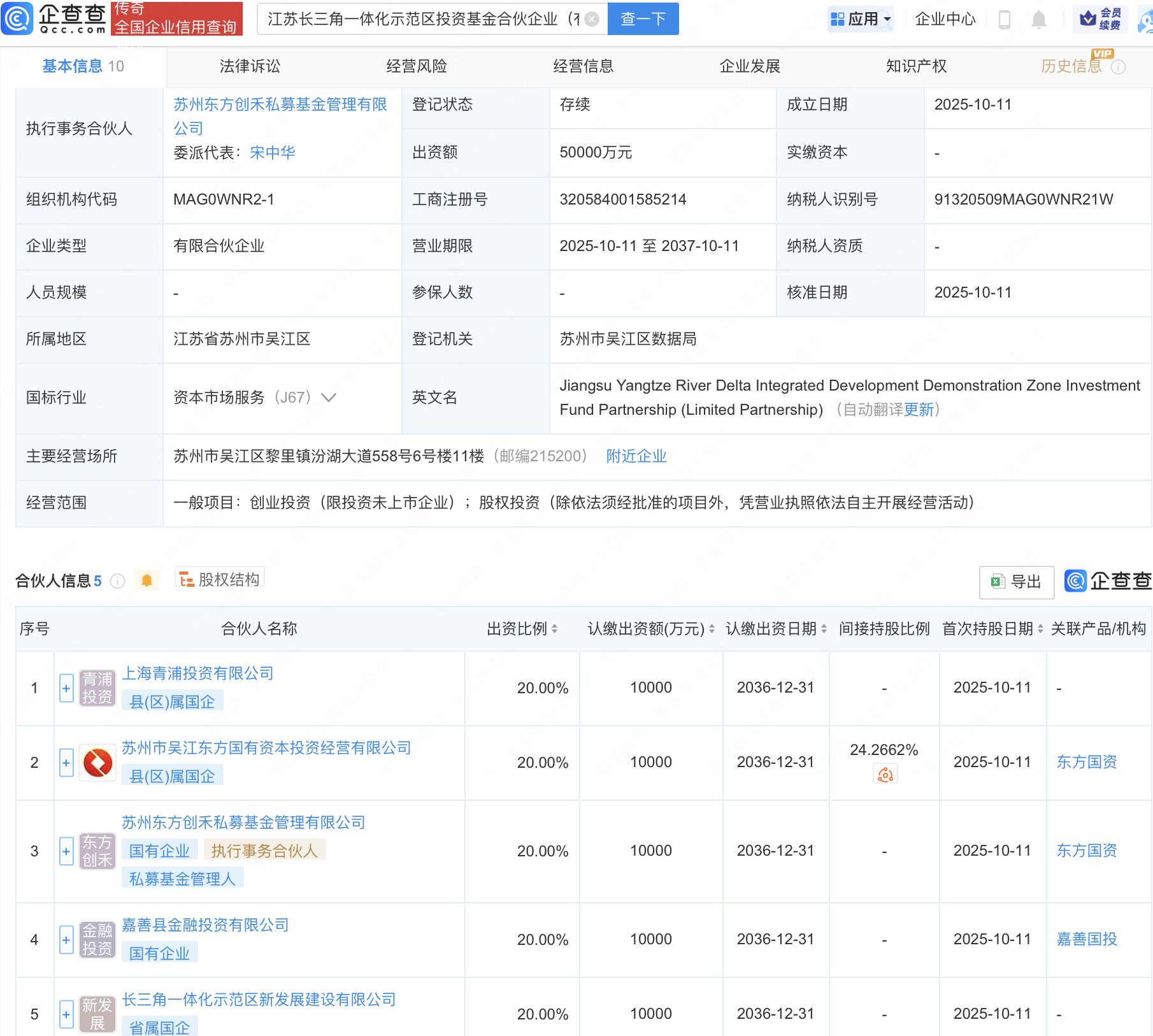 企查查APP显示,近日,江苏长三角一体化示范区投资基金合伙企业(有限合伙)成立,出资额5亿元,经营范围包含:创业投资(限投资未上市企业);股权投资。企查查股权穿透显示,该企业由上海青浦投资有限公司、苏州市吴江东方国有资本投资经营有限公司等共同出资。