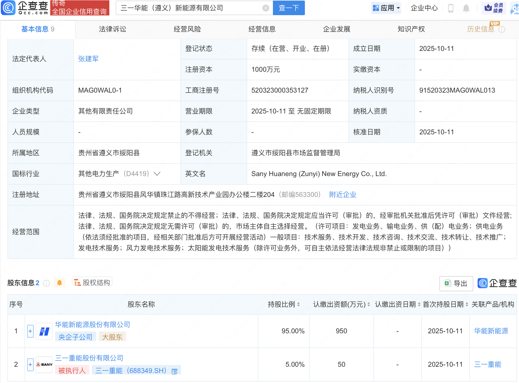 企查查APP显示,近日,三一华能(遵义)新能源有限公司成立,注册资本1000万元,经营范围包含:发电技术服务;风力发电技术服务;太阳能发电技术服务等。企查查股权穿透显示,该公司由华能新能源股份有限公司、三一重能(688349)共同持股。