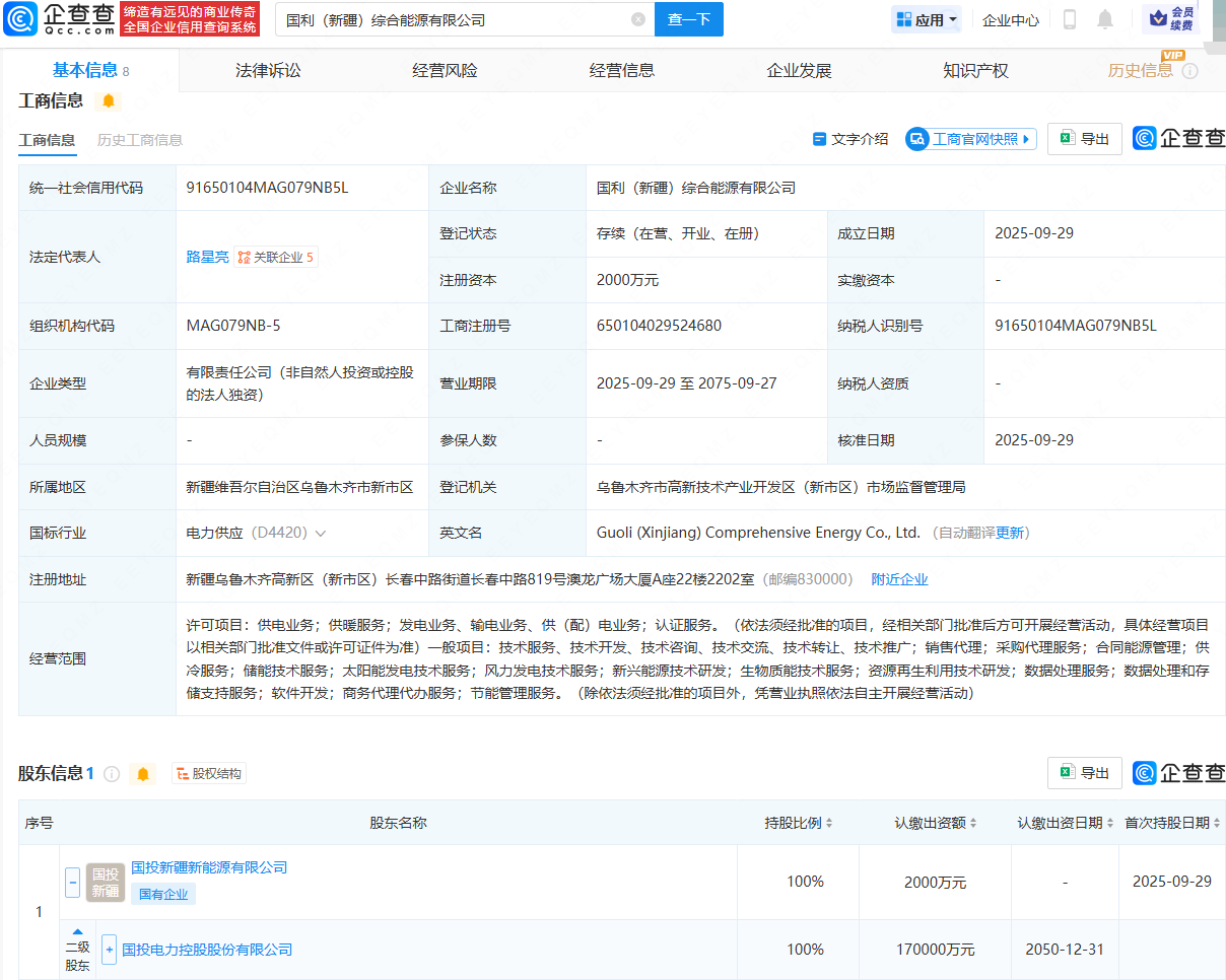 企查查APP显示,近日,国利(新疆)综合能源有限公司成立,法定代表人为路星亮,注册资本为2000万元,经营范围包含:供电业务;供暖服务;发电业务、输电业务、供(配)电业务;风力发电技术服务;生物质能技术服务等。企查查股权穿透显示,该公司由国投电力(600886)间接全资持股。