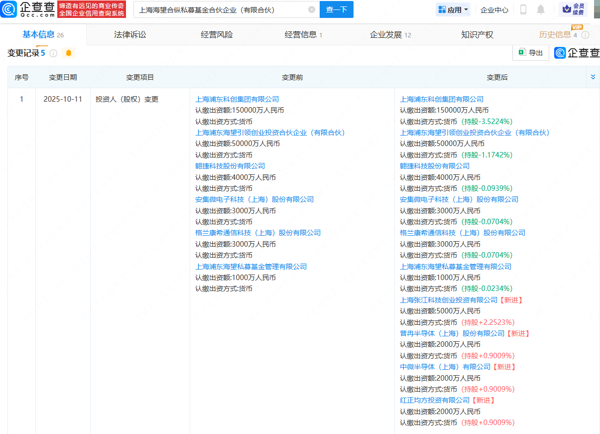 企查查显示,上海海望合纵私募基金合伙企业(有限合伙)成立于2025年3月,出资额22.2亿元,经营范围包含:以私募基金从事股权投资、投资管理、资产管理等活动,现由上海浦东科创集团有限公司、翱捷科技(688220)等及上述新增股东共同持股。