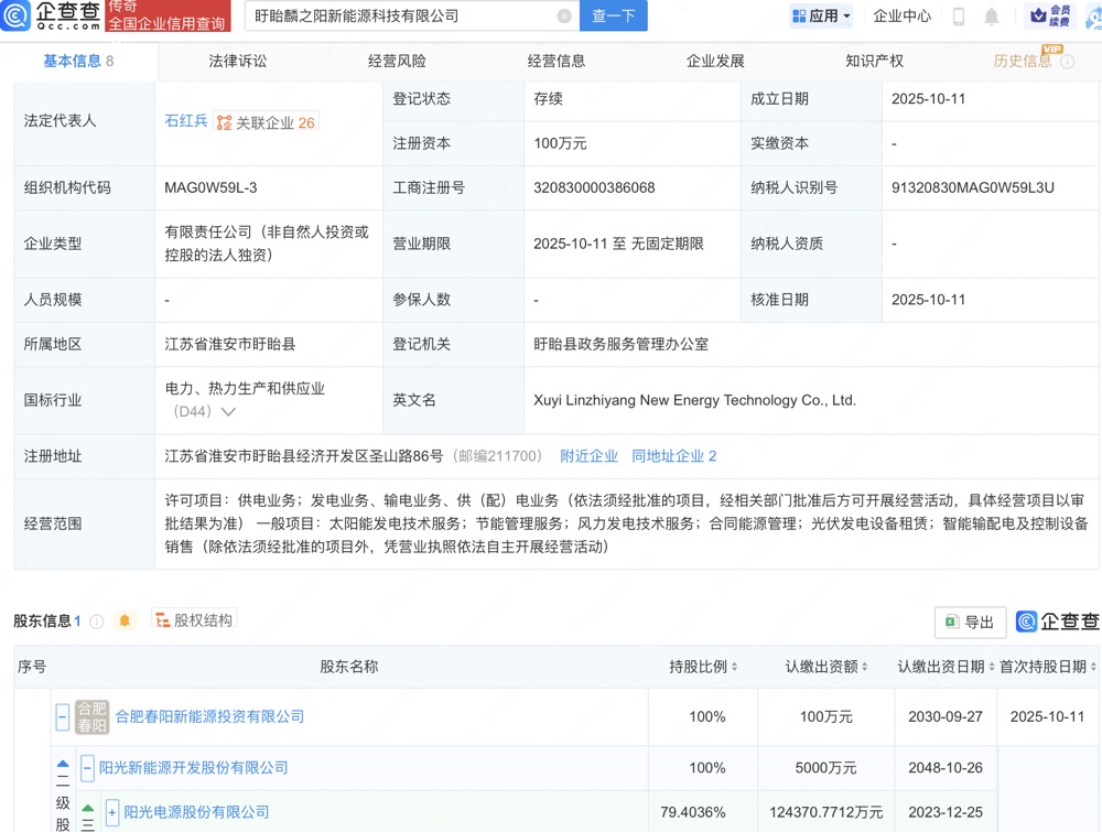 企查查APP显示,近日,盱眙麟之阳新能源科技有限公司成立,法定代表人为石红兵,经营范围含太阳能发电技术服务、节能管理服务、风力发电技术服务、合同能源管理等。企查查股权穿透显示,该公司由阳光电源(300274)旗下合肥春阳新能源投资有限公司全资持股。