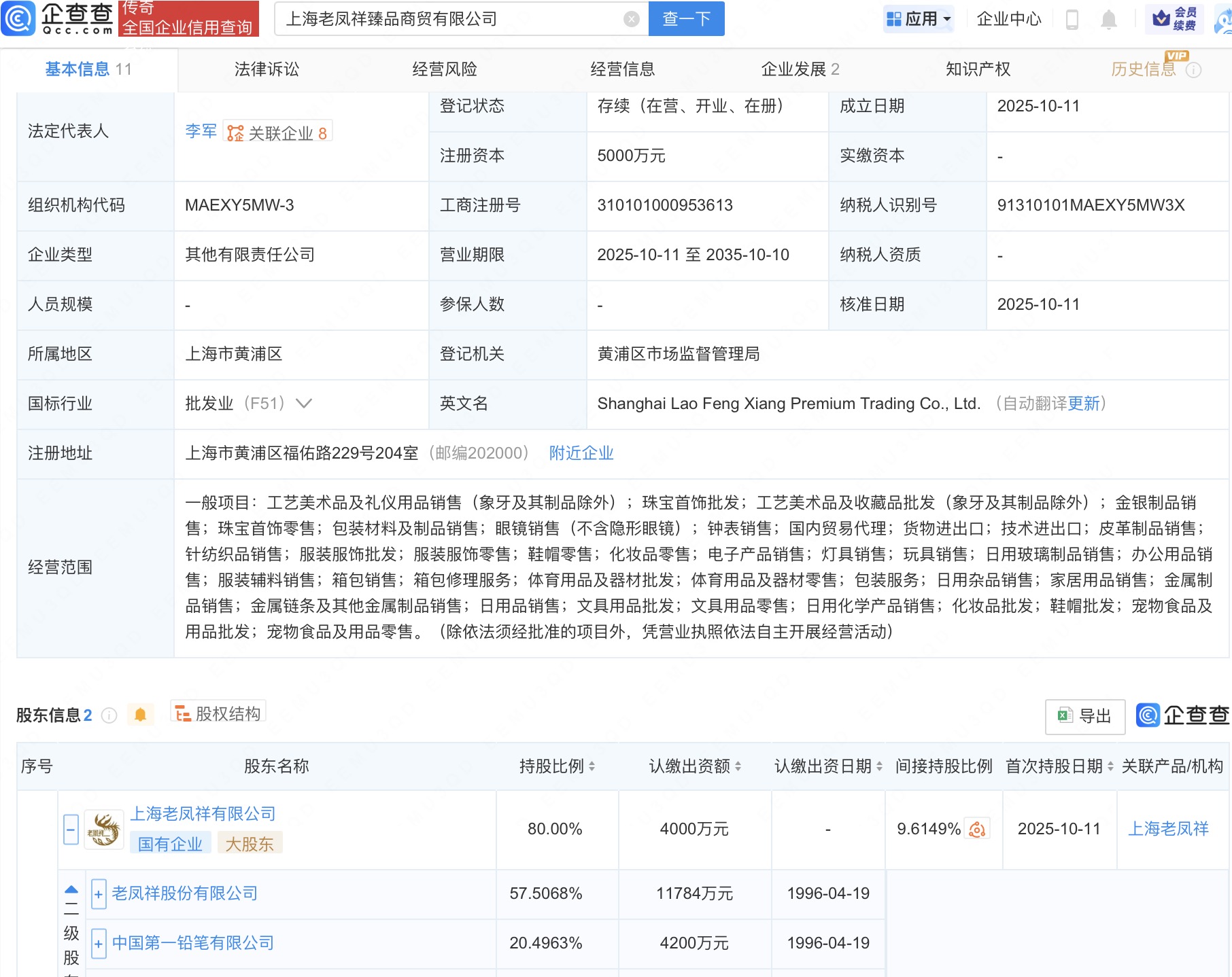 企查查APP显示,近日,上海老凤祥臻品商贸有限公司成立,法定代表人为李军,注册资本5000万人民币,经营范围包括珠宝首饰批发、金银制品销售、国内贸易代理等。企查查股权穿透显示,该公司由老凤祥(600612)旗下上海老凤祥有限公司、上海老凤祥钻石加工中心有限公司共同持股。