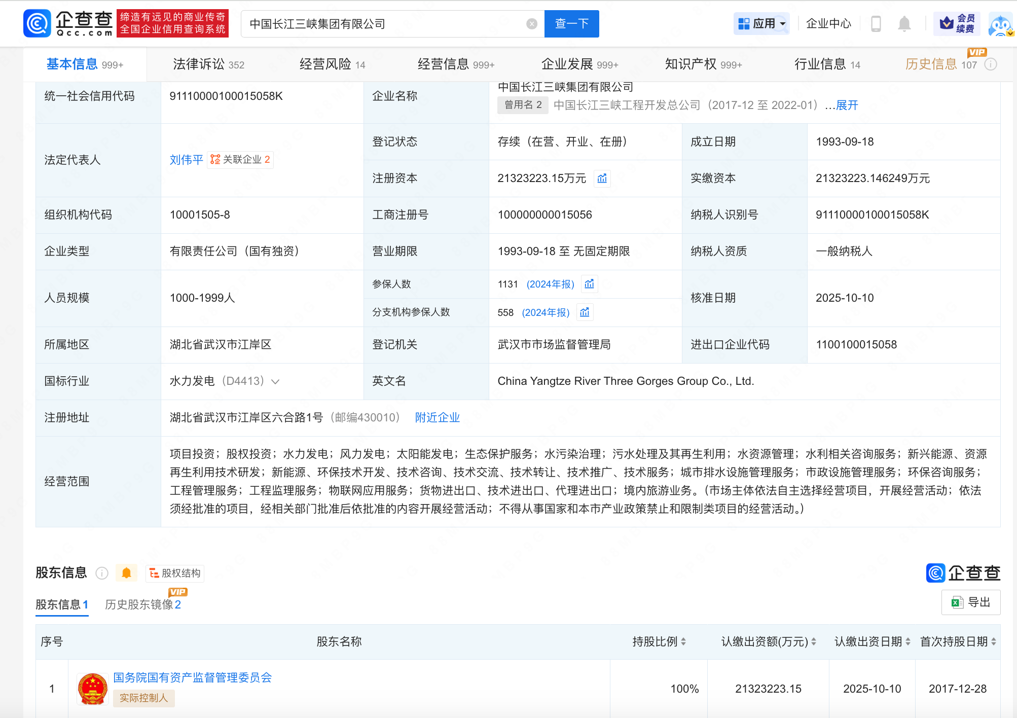 企查查APP显示,近日,中国长江三峡集团有限公司发生工商变更,注册资本由2115亿人民币增至约2132.3亿人民币,同时,多位高管均发生变更。企查查信息显示,该公司成立于1993年9月,法定代表人为刘伟平,经营范围含项目投资、股权投资、水力发电等,由国务院国有资产监督管理委员会全资持股。