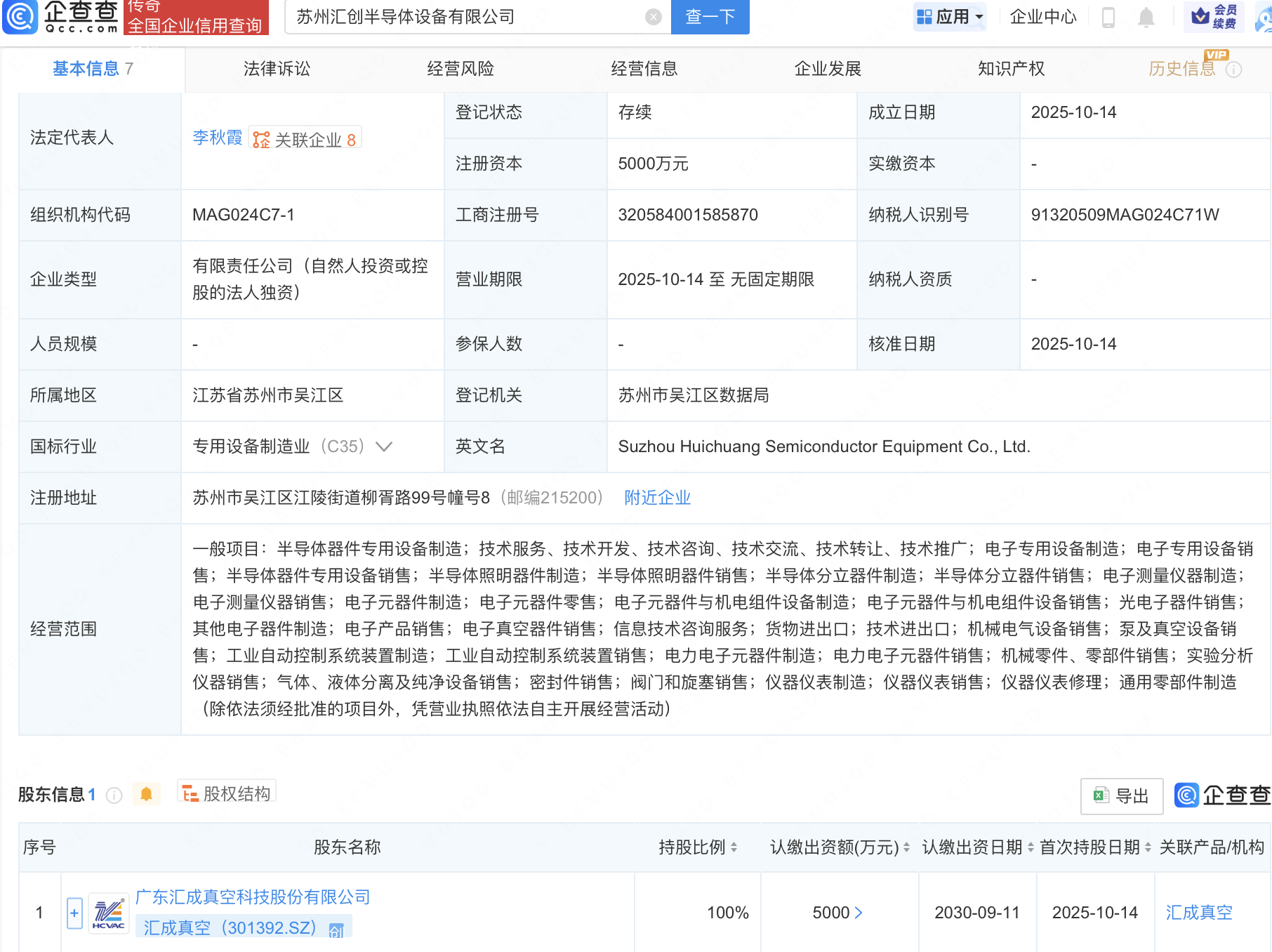 企查查APP显示,近日,苏州汇创半导体设备有限公司成立,注册资本5000万元,经营范围包含:半导体器件专用设备销售;半导体照明器件制造;半导体照明器件销售;半导体分立器件制造等。企查查股权穿透显示,该公司由汇成真空(301392)全资持股。