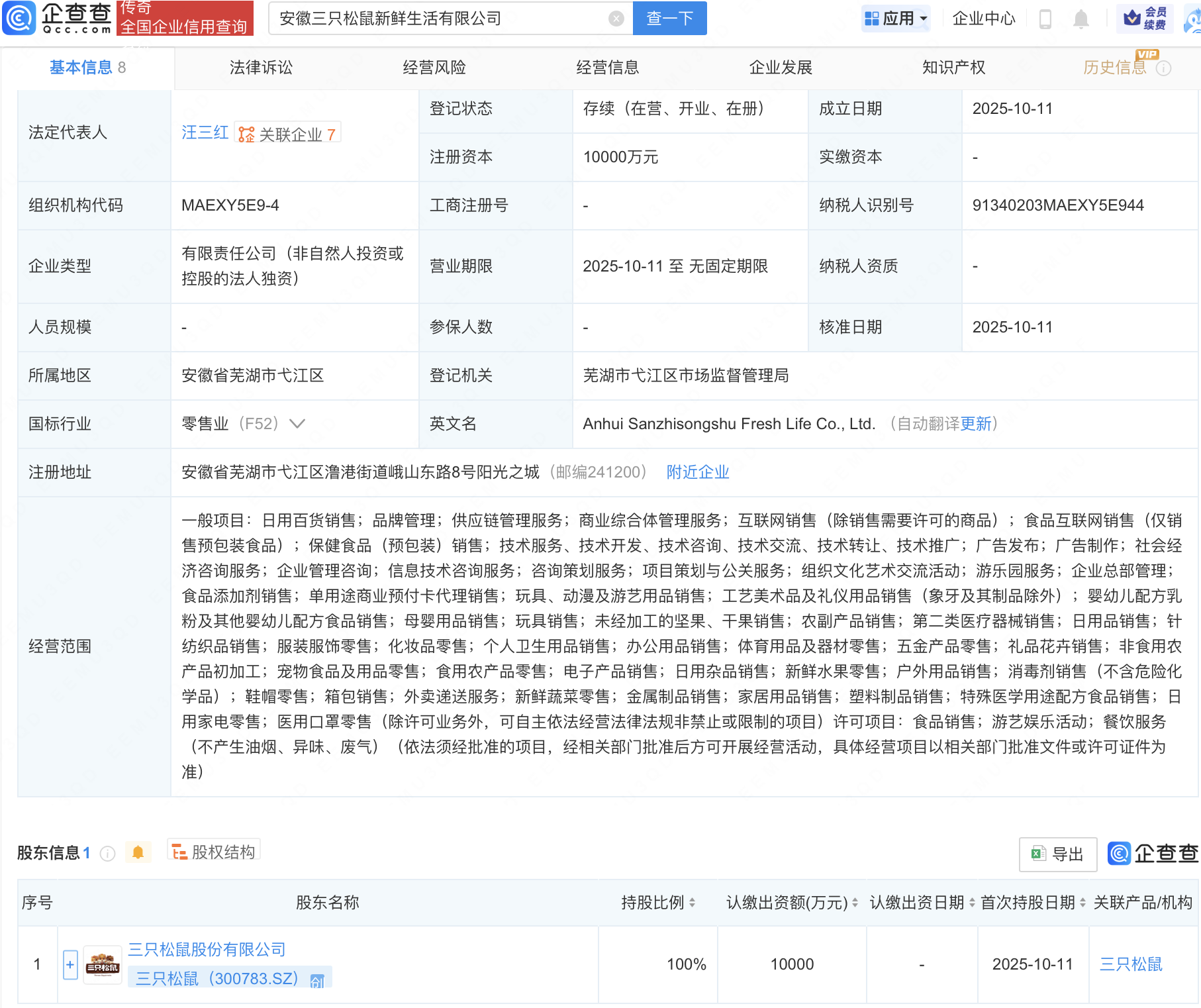 企查查APP显示,近日,安徽三只松鼠新鲜生活有限公司成立,注册资本1亿元,经营范围包含:日用百货销售;品牌管理;供应链管理服务;商业综合体管理服务等。企查查股权穿透显示,该公司由三只松鼠(300783)全资持股。