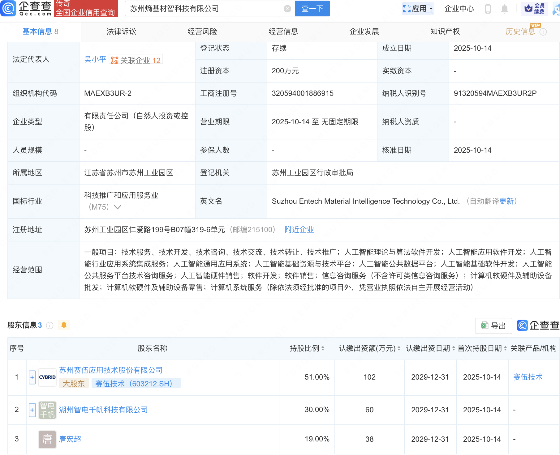 企查查APP显示,近日,苏州熵基材智科技有限公司成立,法定代表人为吴小平,经营范围包含:人工智能理论与算法软件开发;人工智能应用软件开发;人工智能行业应用系统集成服务;人工智能通用应用系统等。企查查股权穿透显示,该公司由赛伍技术(603212)等共同持股。