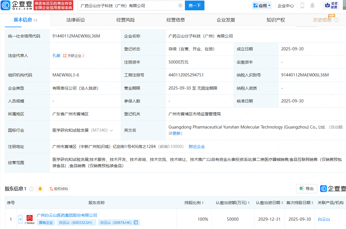 企查查APP显示,近日,广药云山分子科技(广州)有限公司成立,法定代表人为孔箭,注册资本为5亿元,经营范围包含:医学研究和试验发展;以自有资金从事投资活动;第二类医疗器械销售等。企查查股权穿透显示,该公司由白云山(600332)全资持股。