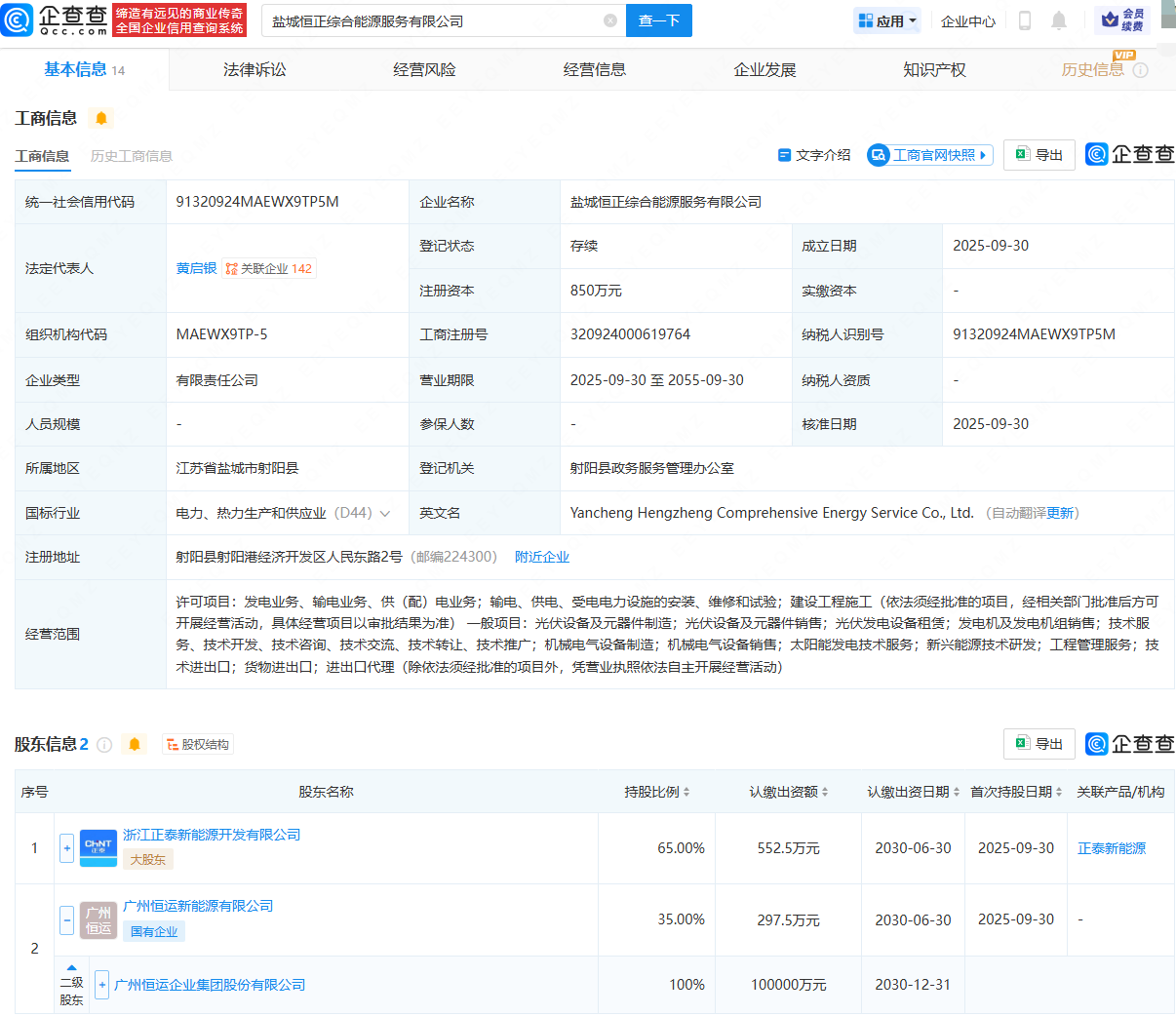 企查查APP显示,近日,盐城恒正综合能源服务有限公司成立,法定代表人为黄启银,经营范围包含:发电业务、输电业务、供(配)电业务;光伏设备及元器件制造;光伏设备及元器件销售;光伏发电设备租赁等。企查查股权穿透显示,该公司由浙江正泰新能源开发有限公司、穗恒运A(000531)全资子公司广州恒运新能源有限公司共同持股。
