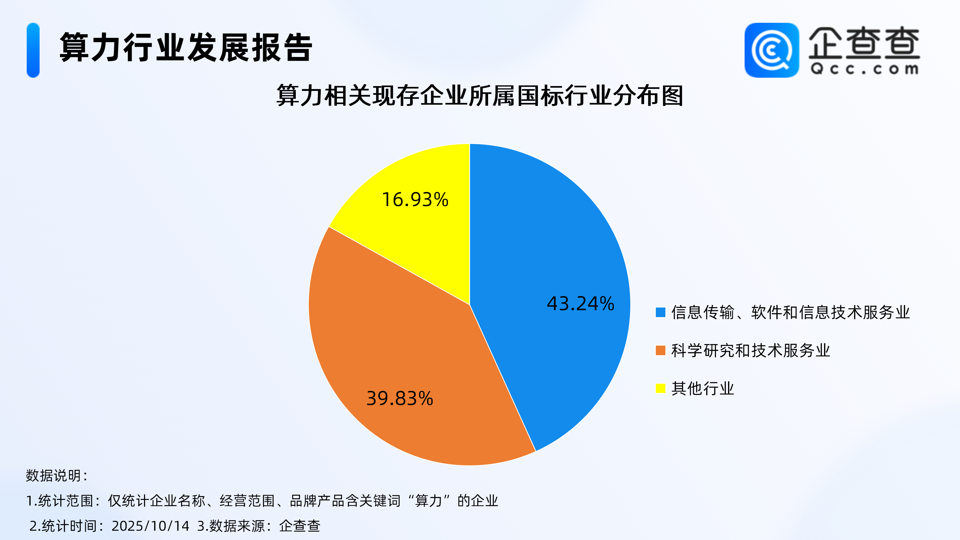 企查查数据显示,国标行业分布上,国内算力相关现存企业中,归属于信息传输、软件和信息技术服务业的相关企业最多,占比达43.24%,其次为归属于科学研究和技术服务业的相关企业,占比达39.83%。
