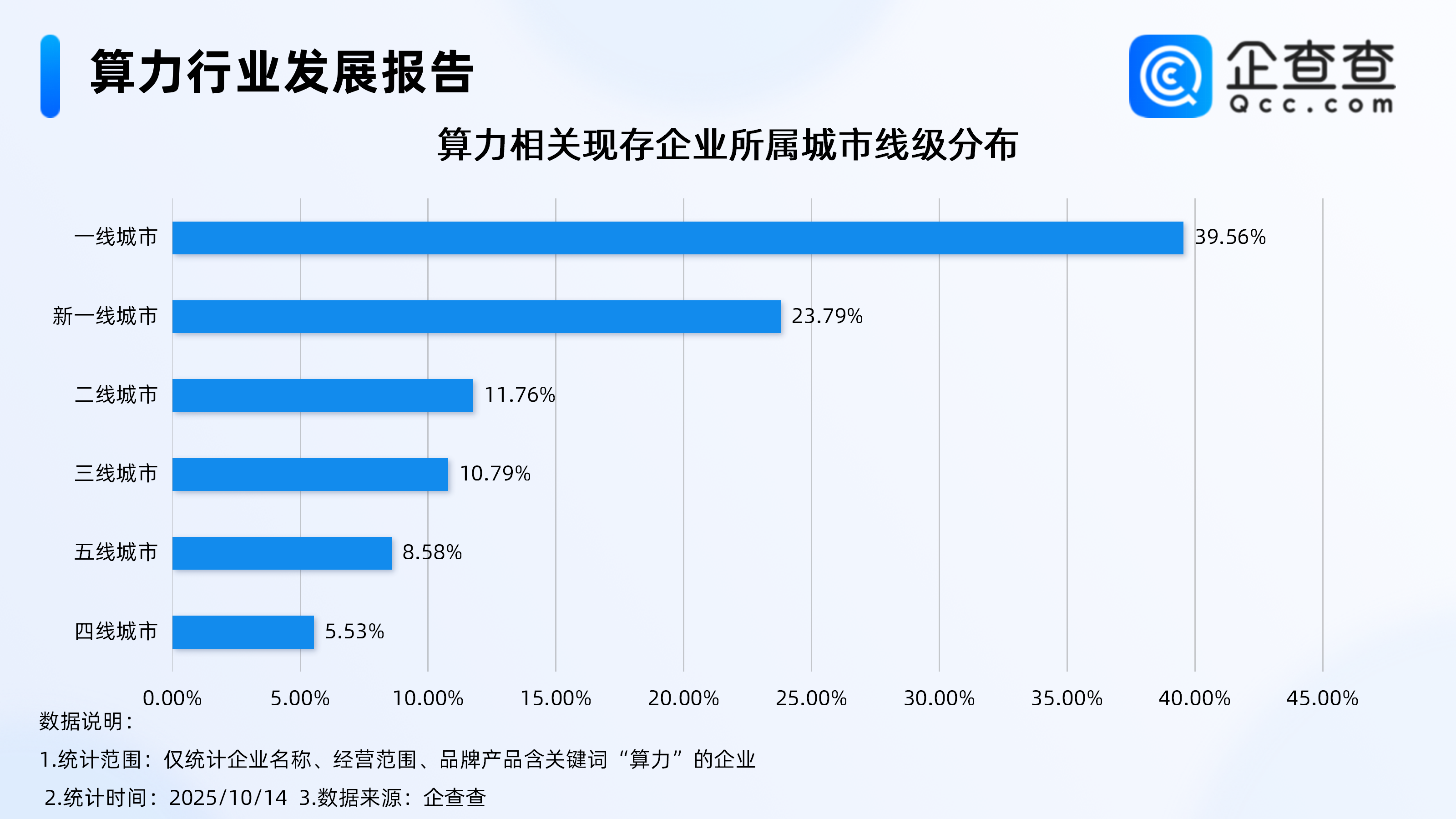 企查查数据显示,截至10月14日,国内算力相关企业现存量达732家,主要分布在一线城市、新一线城市,分别占比39.56%、23.79%。位于二线、三线城市的相关企业,均占比10%-12%之间。