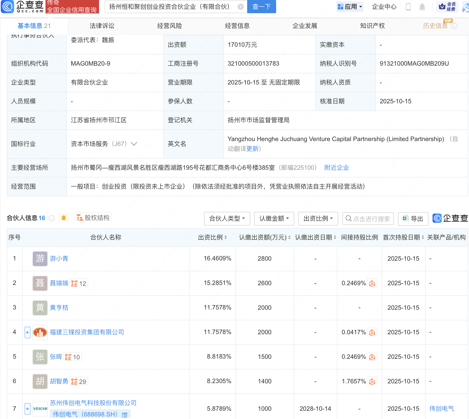 企查查APP显示,近日,扬州恒和聚创创业投资合伙企业(有限合伙)成立,出资额约1.7亿元,经营范围包含:创业投资(限投资未上市企业)。企查查股权穿透显示,该企业由伟创电气(688698)等共同出资。