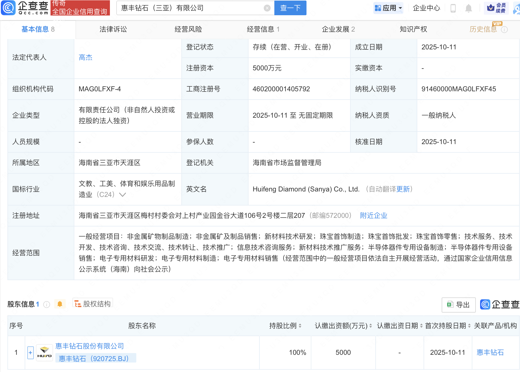 企查查APP显示,近日,惠丰钻石(三亚)有限公司成立,注册资本5000万元,经营范围包含:新材料技术推广服务;半导体器件专用设备制造;半导体器件专用设备销售;电子专用材料研发等。企查查股权穿透显示,该公司由惠丰钻石(920725)全资持股。