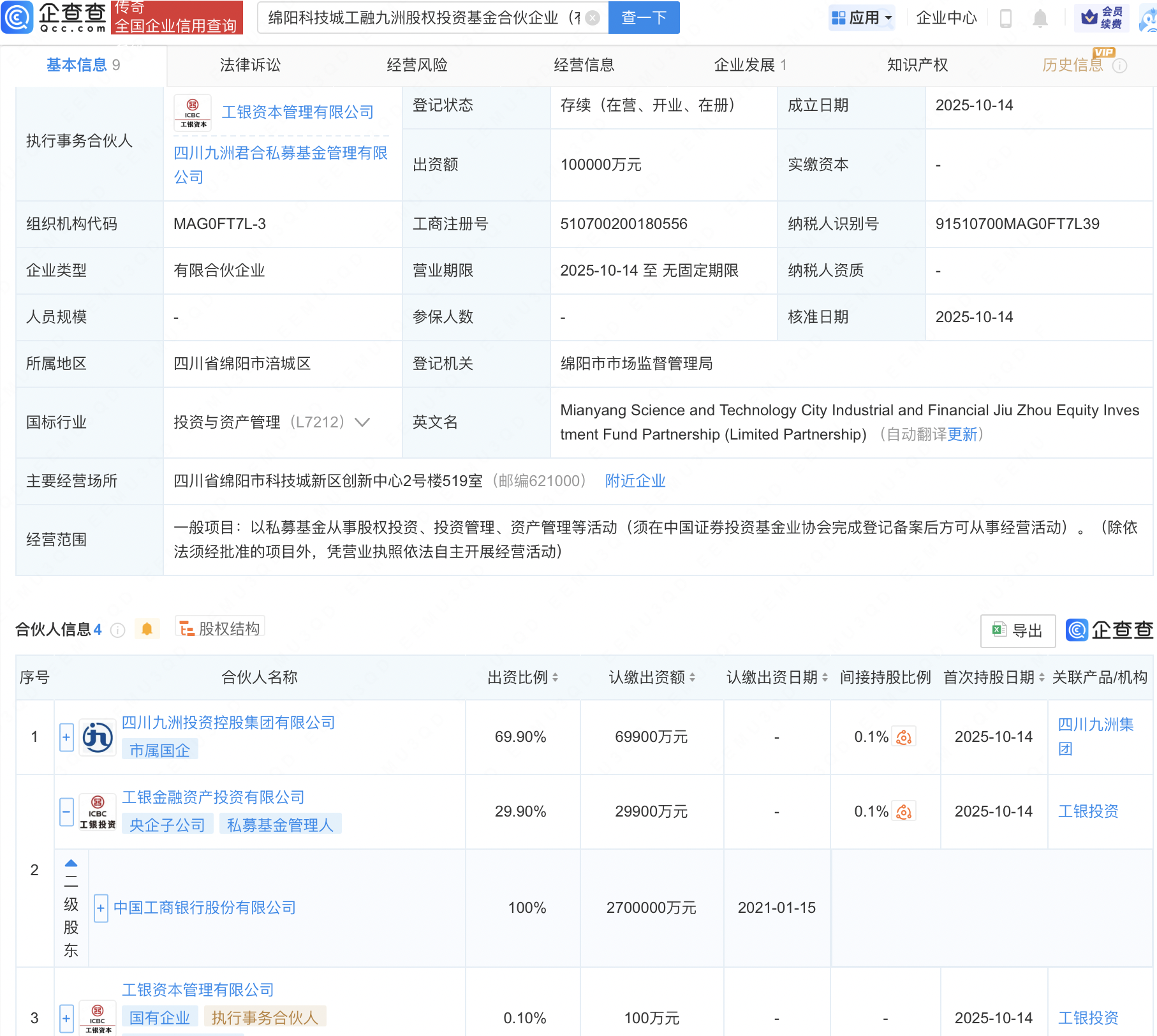 企查查APP显示,近日,绵阳科技城工融九洲股权投资基金合伙企业(有限合伙)成立,出资额10亿元,经营范围包含:以私募基金从事股权投资、投资管理、资产管理等活动。企查查股权穿透显示,该企业由四川九洲投资控股集团有限公司、工商银行(601398)全资子公司工银金融资产投资有限公司等共同出资。