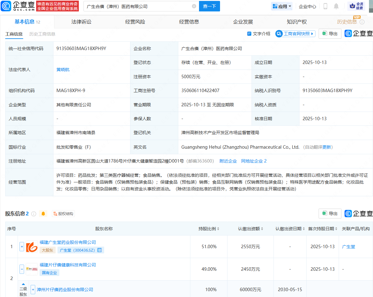 企查查APP显示,近日,广生合癀(漳州)医药有限公司成立,法定代表人为黄晓航,注册资本为5000万元,经营范围包含:药品批发;第三类医疗器械经营;食品销售;保健食品(预包装)销售;食品互联网销售(仅销售预包装食品)等。企查查股权穿透显示,该公司由广生堂(300436)、片仔癀(600436)全资子公司福建片仔癀健康科技有限公司共同持股。