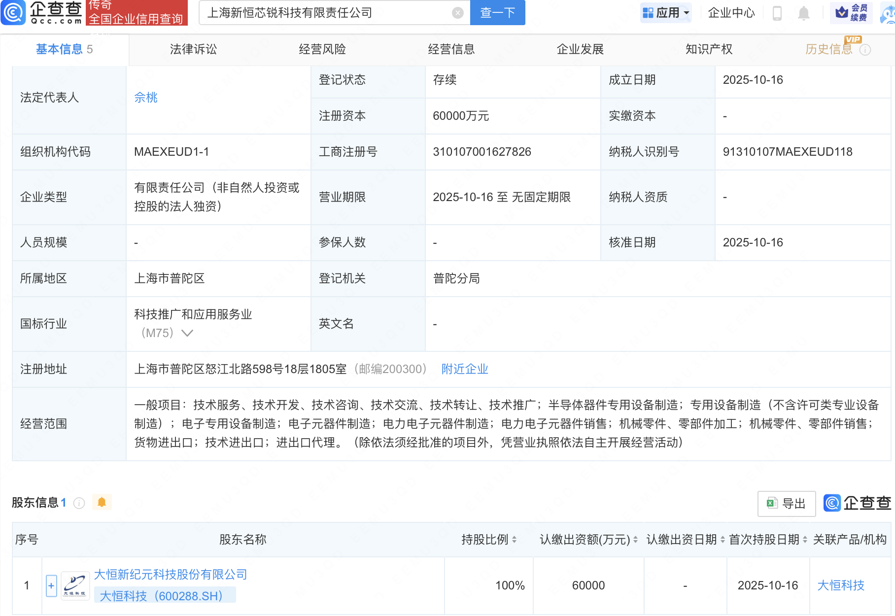 企查查APP显示,近日,上海新恒芯锐科技有限责任公司成立,注册资本6亿元,经营范围包含:半导体器件专用设备制造;电子专用设备制造;电子元器件制造;电力电子元器件制造等。企查查股权穿透显示,该公司由大恒科技(600288)全资持股。