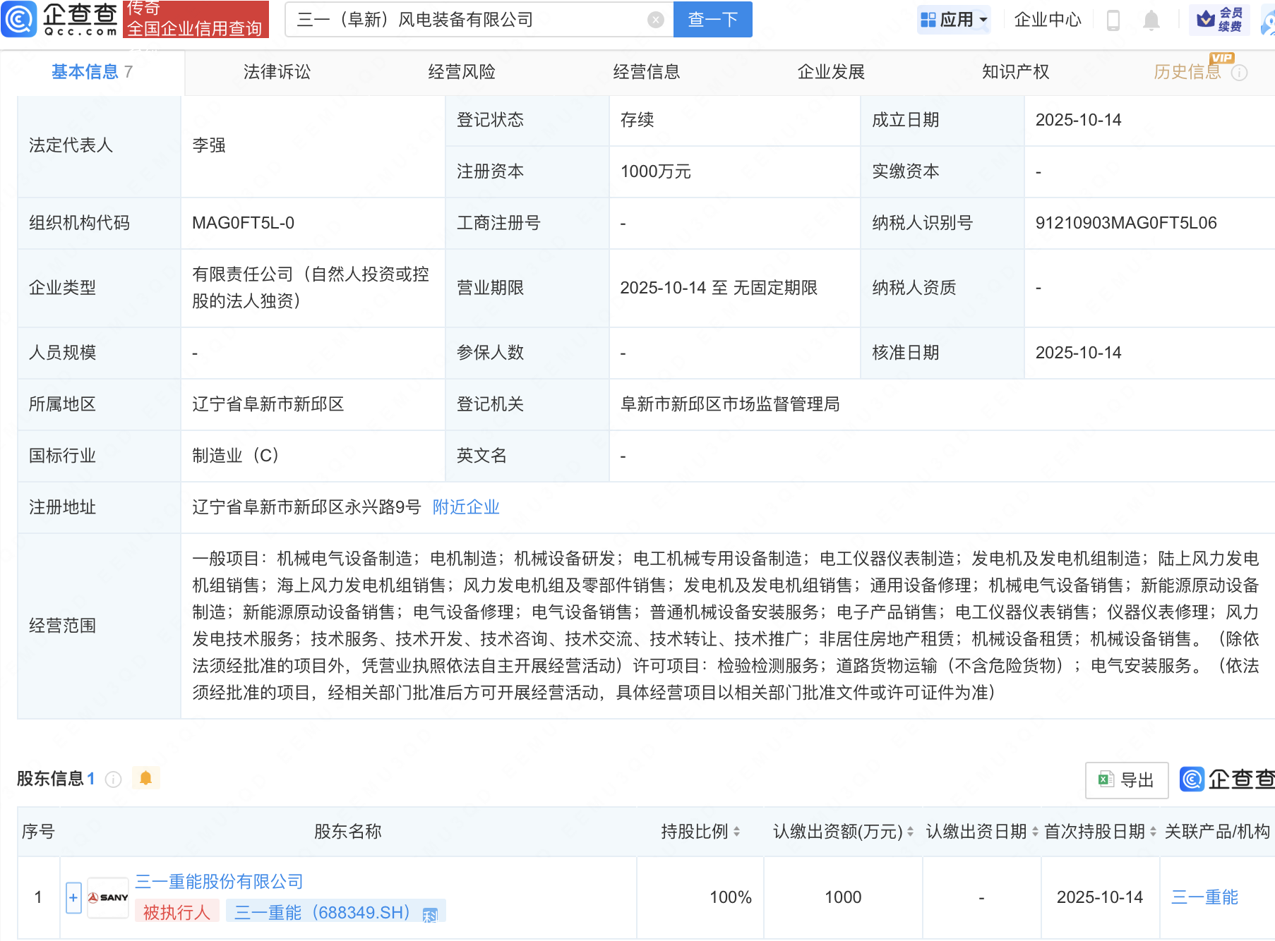 企查查APP显示,近日,三一(阜新)风电装备有限公司成立,注册资本1000万元,经营范围包含:电工仪器仪表制造;发电机及发电机组制造;陆上风力发电机组销售;海上风力发电机组销售等。企查查股权穿透显示,该公司由三一重能(688349)全资持股。