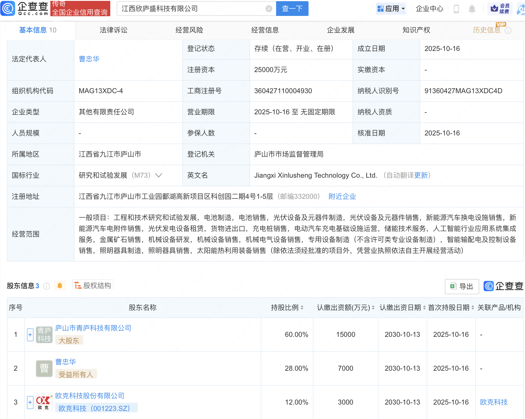 企查查APP显示,近日,江西欣庐盛科技有限公司成立,注册资本2.5亿元,经营范围包含:电池制造,电池销售,充电桩销售,电动汽车充电基础设施运营,储能技术服务,人工智能行业应用系统集成服务等。企查查股权穿透显示,该公司由欧克科技(001223)等共同持股。
