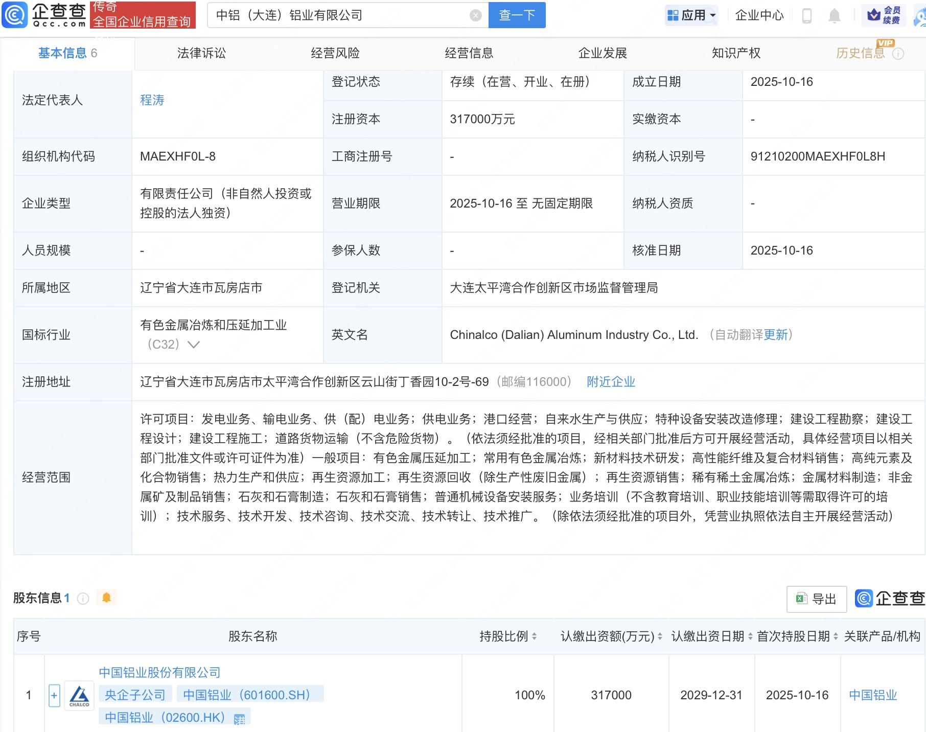 企查查APP显示,近日,中铝(大连)铝业有限公司成立,法定代表人为程涛,注册资本31.7亿人民币,经营范围包括有色金属压延加工、常用有色金属冶炼、新材料技术研发等。企查查股权穿透显示,该公司由中国铝业(601600)全资持股。