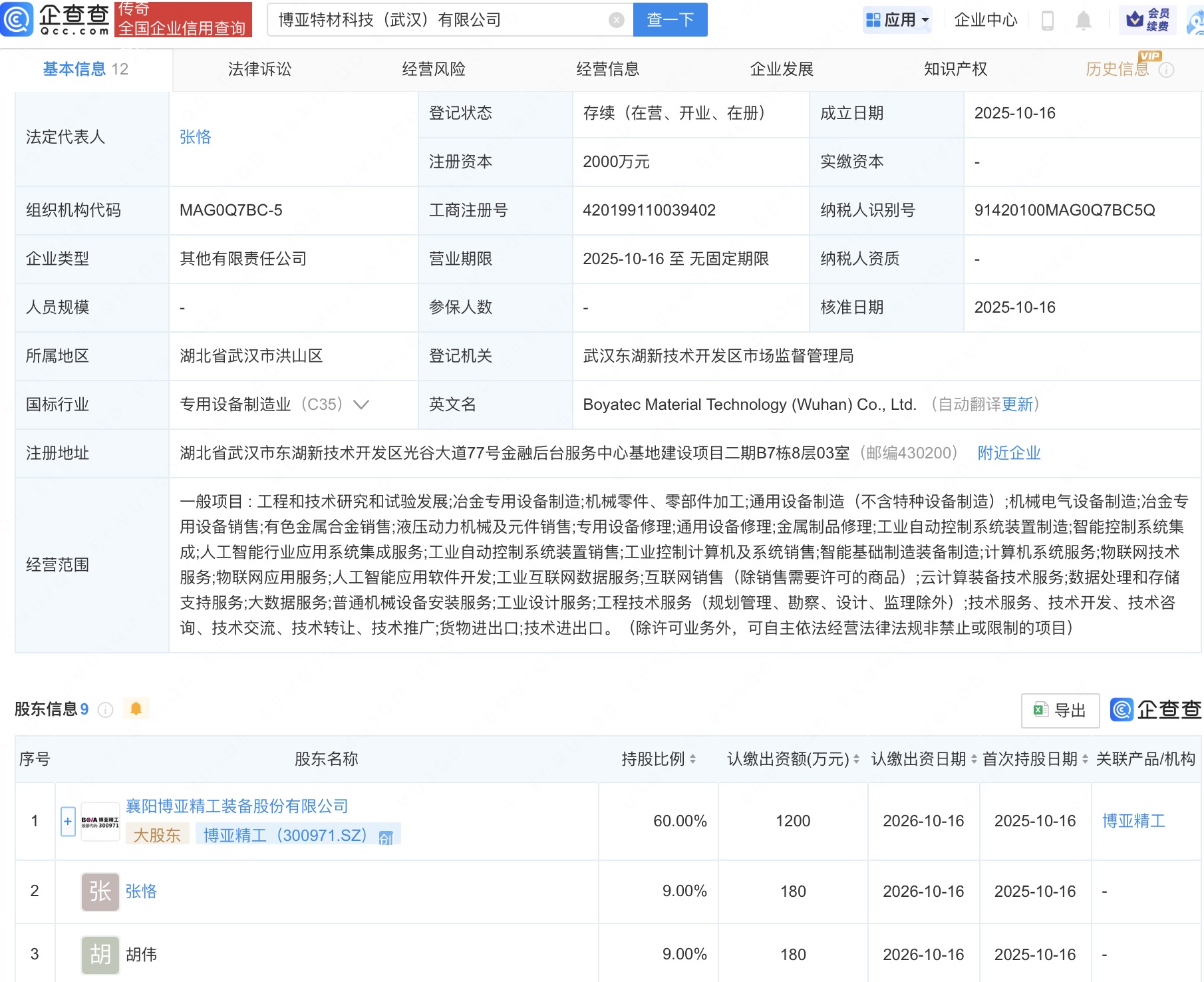 企查查APP显示,近日,博亚特材科技(武汉)有限公司成立,法定代表人为张恪,注册资本2000万人民币,经营范围包括工程和技术研究和试验发展、人工智能行业应用系统集成服务、工业控制计算机及系统销售等。企查查股权穿透显示,该公司由博亚精工(300971)等共同持股。