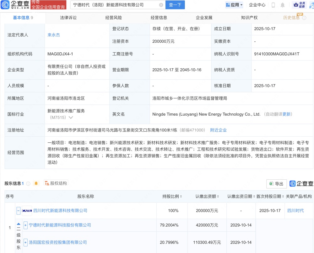企查查APP显示,近日,宁德时代(洛阳)新能源科技有限公司成立,法定代表人为来永杰,注册资本20亿人民币,经营范围包括电池制造、电池销售、新兴能源技术研发、新材料技术研发等。企查查股权穿透显示,该公司由宁德时代(300750)旗下四川时代新能源科技有限公司全资持股。