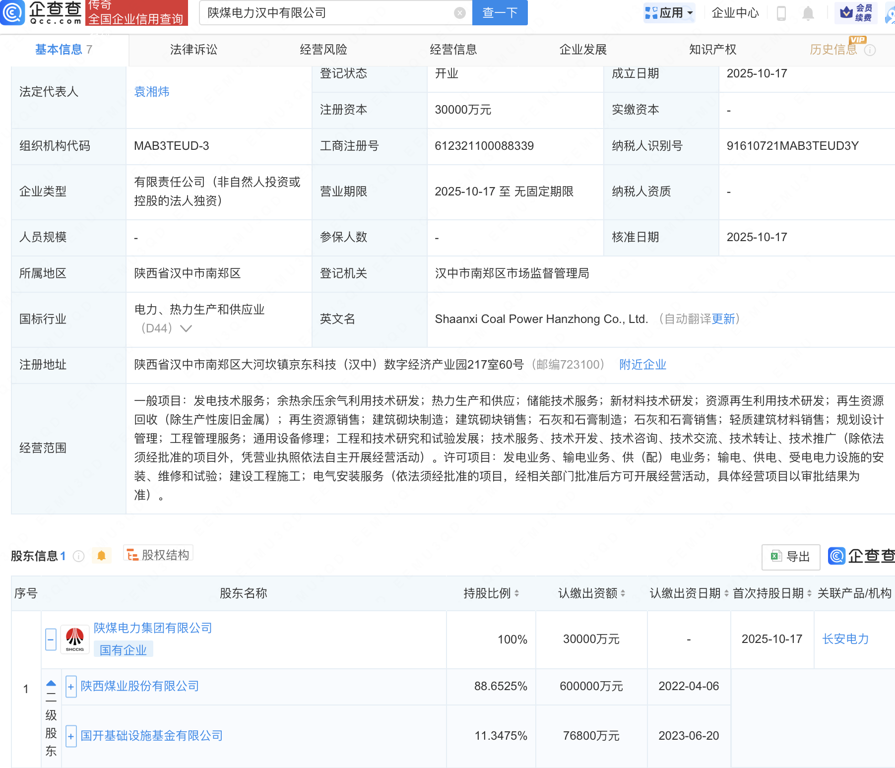 企查查APP显示,近日,陕煤电力汉中有限公司成立,注册资本3亿元,经营范围包含:热力生产和供应;储能技术服务;新材料技术研发;资源再生利用技术研发等。企查查股权穿透显示,该公司由陕西煤业(601225)旗下陕煤电力集团有限公司全资持股。