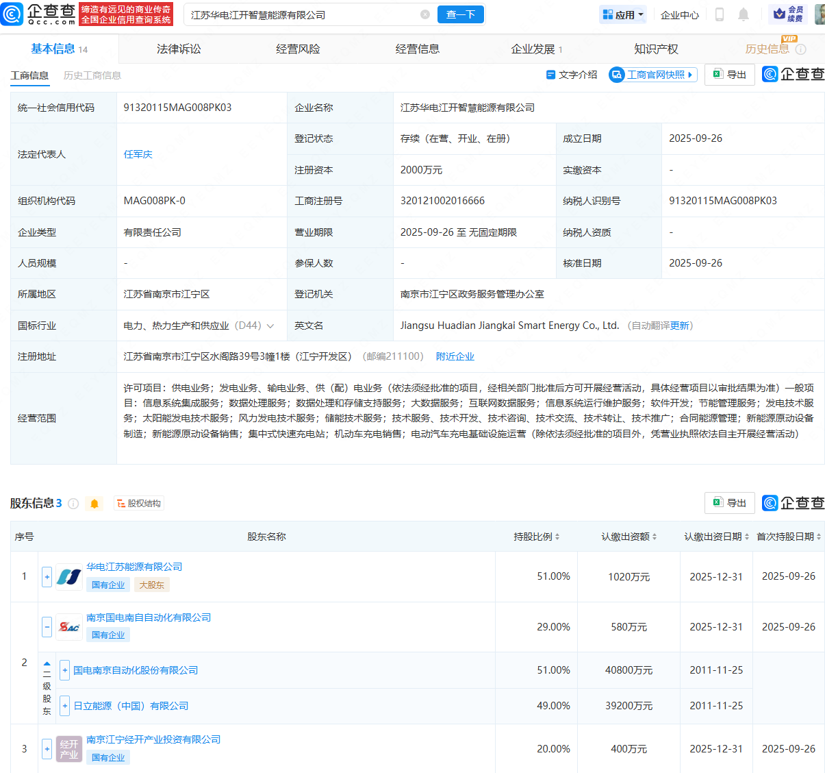 企查查APP显示,近日,江苏华电江开智慧能源有限公司成立,法定代表人为任军庆,注册资本为2000万元,经营范围包含:供电业务;发电业务、输电业务、供(配)电业务;数据处理服务;数据处理和存储支持服务等。企查查股权穿透显示,该公司由华电江苏能源有限公司、国电南自(600268)控股子公司南京国电南自自动化有限公司等共同持股。