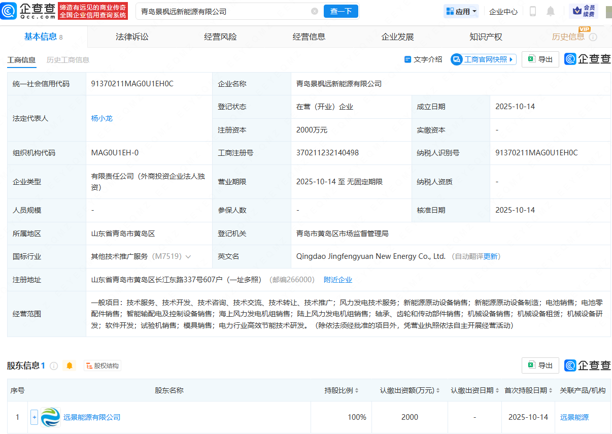 企查查APP显示,近日,青岛景枫远新能源有限公司成立,法定代表人为杨小龙,注册资本为2000万元,经营范围包含:风力发电技术服务;电池销售;电池零配件销售;海上风力发电机组销售;陆上风力发电机组销售等。企查查股权穿透显示,该公司由远景能源有限公司全资持股。