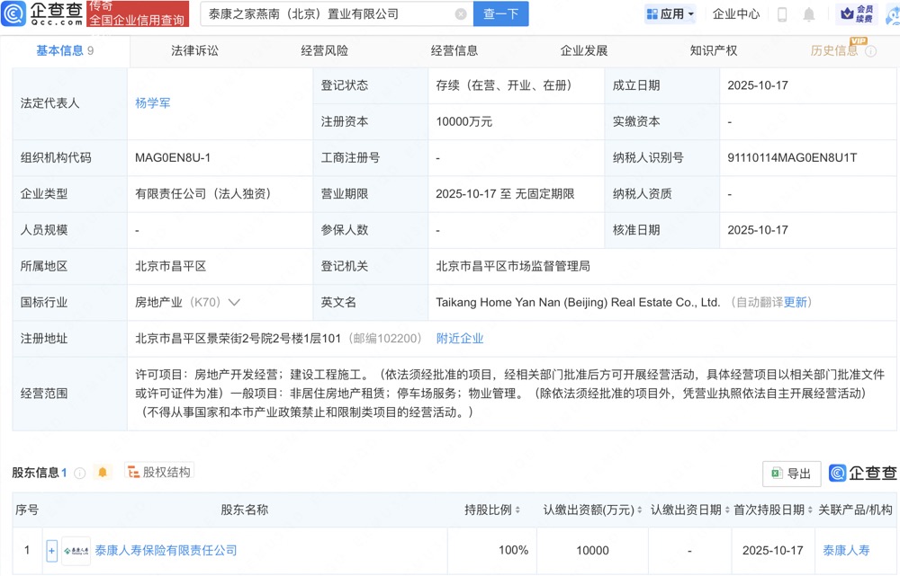 企查查APP显示,近日,泰康之家燕南(北京)置业有限公司成立,法定代表人为杨学军,注册资本1亿人民币,经营范围包括房地产开发经营、建设工程施工、非居住房地产租赁等。企查查股权穿透显示,该公司由泰康人寿保险有限责任公司全资持股。