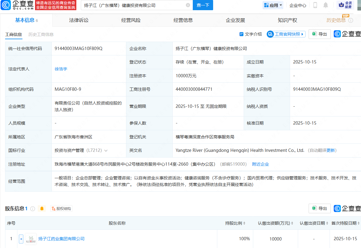 企查查APP显示,近日,扬子江(广东横琴)健康投资有限公司成立,法定代表人为徐浩宇,注册资本为1亿元,经营范围包含:企业总部管理;企业管理咨询;以自有资金从事投资活动;国内贸易代理;供应链管理服务等。企查查股权穿透显示,该公司由扬子江药业集团有限公司全资持股。