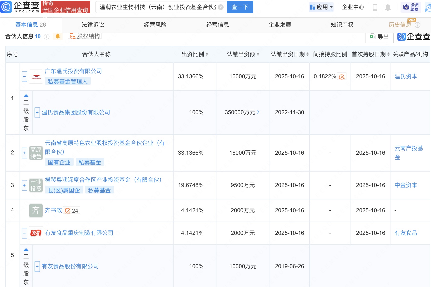 企查查APP显示,近日,温润农业生物科技(云南)创业投资基金合伙企业(有限合伙)成立,出资额约4.8亿人民币,经营范围为创业投资。企查查股权穿透显示,该企业由温氏股份(300498)全资子公司广东温氏投资有限公司、有友食品(603697)全资子公司有友食品重庆制造有限公司等共同出资。