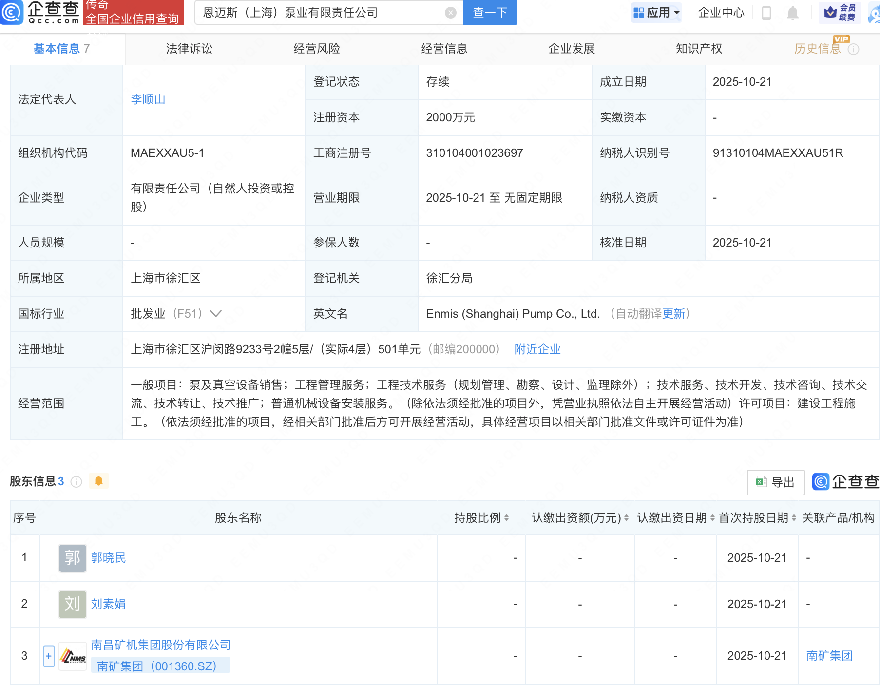 企查查APP显示,近日,恩迈斯(上海)泵业有限责任公司成立,注册资本2000万元,经营范围包含:泵及真空设备销售;工程管理服务;工程技术服务(规划管理、勘察、设计、监理除外)等。企查查股权穿透显示,该公司由南矿集团(001360)等共同持股。