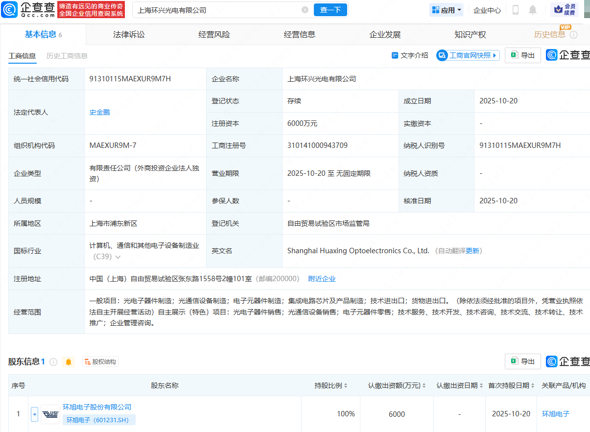 企查查APP显示,上海环兴光电有限公司成立,法定代表人为史金鹏,注册资本为6000万元,经营范围包含:光电子器件制造;光通信设备制造;电子元器件制造;集成电路芯片及产品制造等。企查查股权穿透显示,该公司由环旭电子(601231)全资持股。