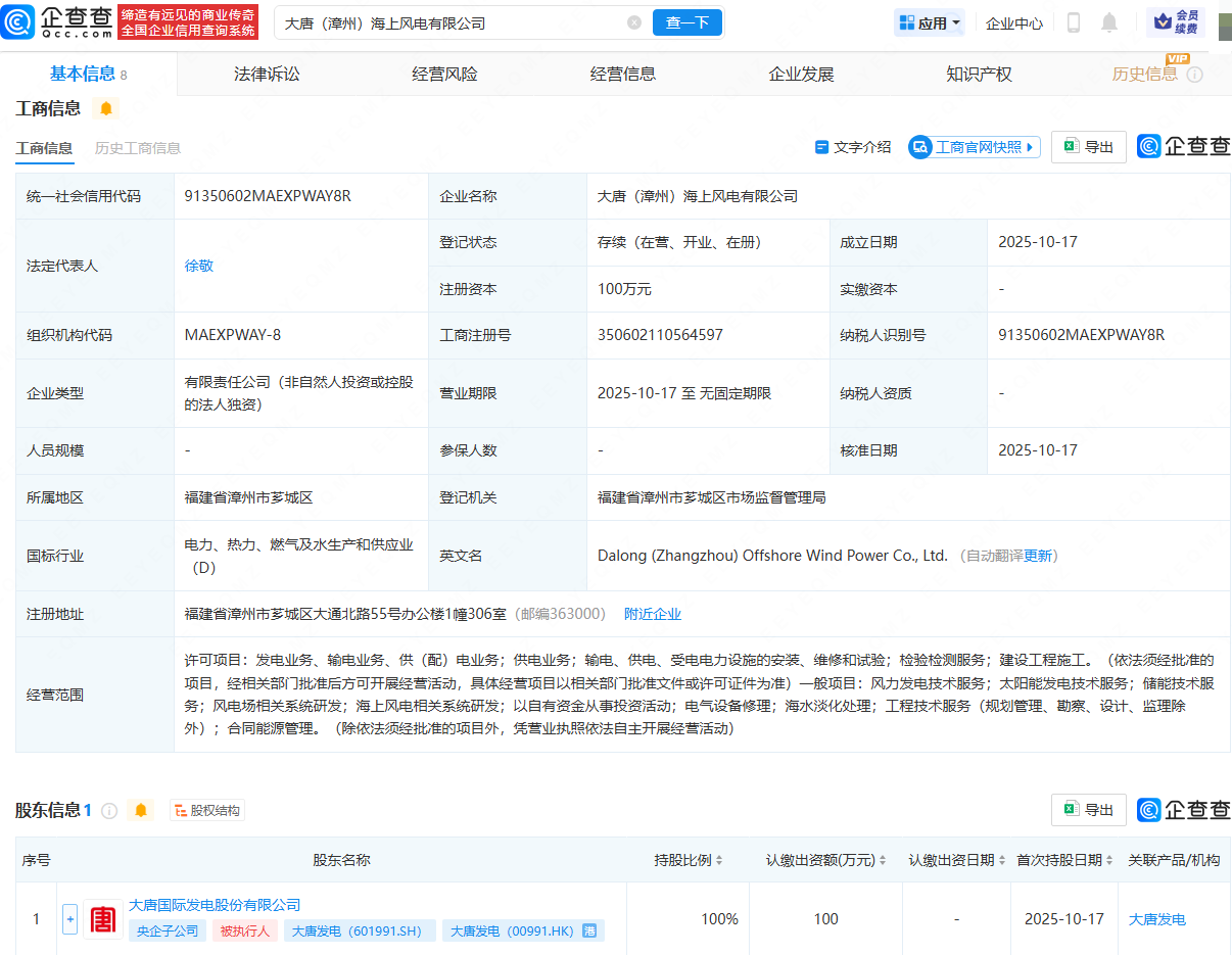 企查查APP显示,近日,大唐(漳州)海上风电有限公司成立,法定代表人为徐敬,经营范围包含:发电业务、输电业务、供(配)电业务;供电业务;风力发电技术服务;太阳能发电技术服务;海上风电相关系统研发等。企查查股权穿透显示,该公司由大唐发电(601991)全资持股。