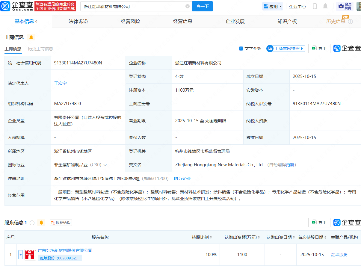 企查查APP显示,近日,浙江红墙新材料有限公司成立,法定代表人为王宏宇,注册资本为1100万元,经营范围包含:新型建筑材料制造(不含危险化学品);建筑材料销售;新材料技术研发;涂料销售(不含危险化学品)等。企查查股权穿透显示,该公司由红墙股份(002809)全资持股。