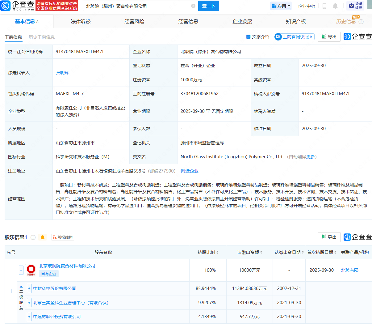 企查查APP显示,近日,北玻院(滕州)聚合物有限公司成立,法定代表人为张明辉,注册资本为1亿元,经营范围包含:新材料技术研发;工程塑料及合成树脂制造;玻璃纤维增强塑料制品制造;高性能纤维及复合材料制造等。企查查股权穿透显示,该公司由中材科技(002080)旗下北京玻钢院复合材料有限公司全资持股。