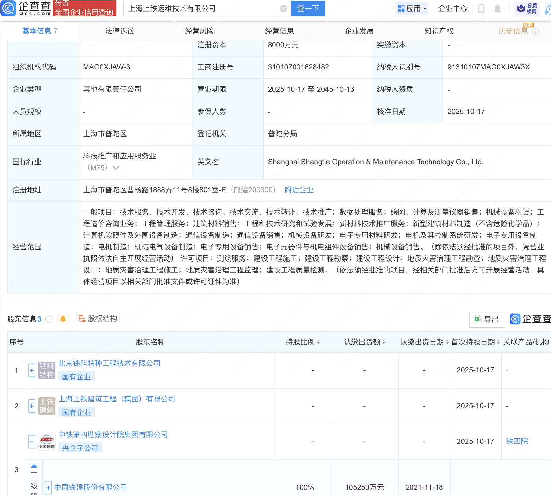 企查查APP显示,近日,上海上铁运维技术有限公司成立,注册资本8000万元,经营范围包含:电子专用材料研发;电机及其控制系统研发;电子专用设备制造等。企查查股权穿透显示,该公司由中国铁建(601186)全资子公司中铁第四勘察设计院集团有限公司等共同持股。