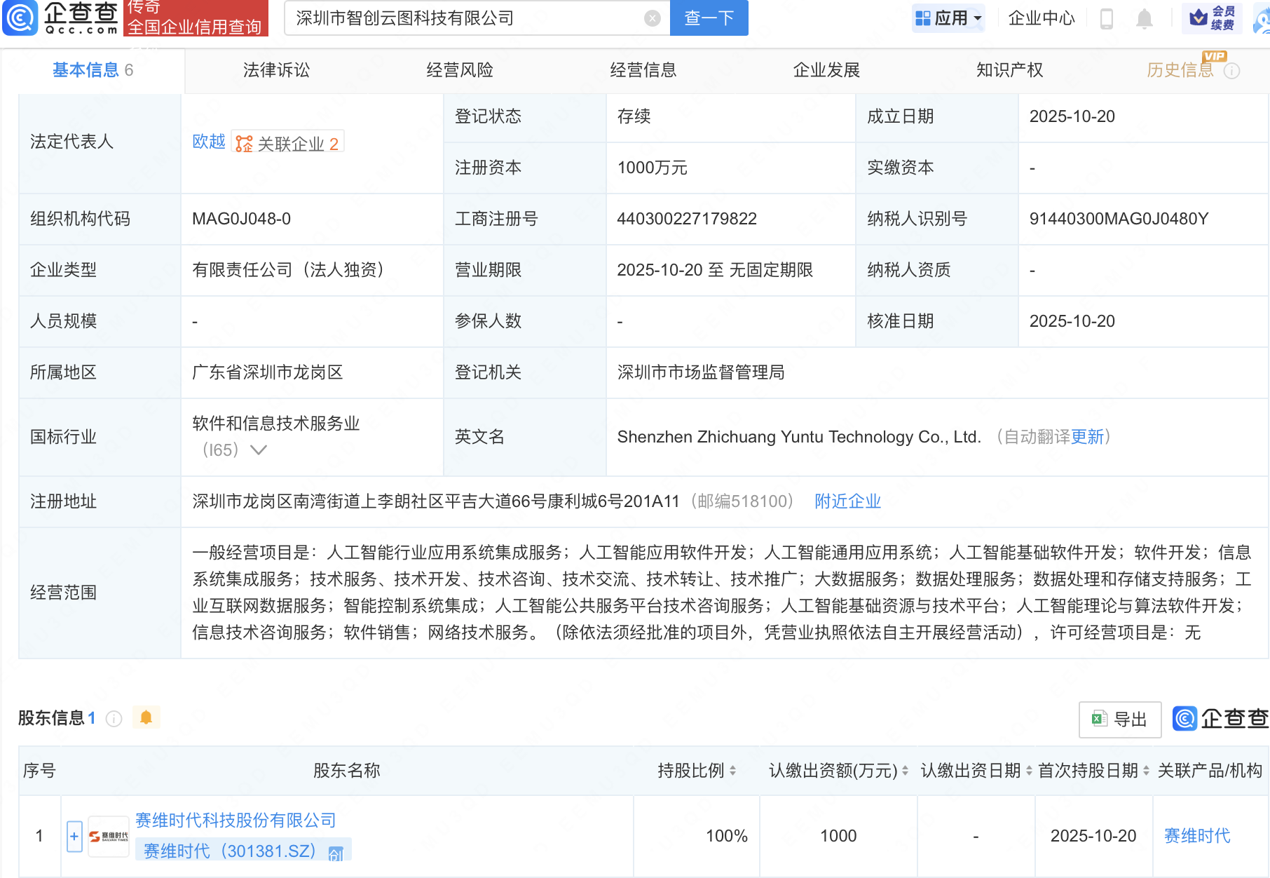 企查查APP显示,近日,深圳市智创云图科技有限公司成立,注册资本1000万元,经营范围包含:人工智能行业应用系统集成服务;人工智能应用软件开发;人工智能通用应用系统;人工智能基础软件开发等。企查查股权穿透显示,该公司由赛维时代(301381)全资持股。
