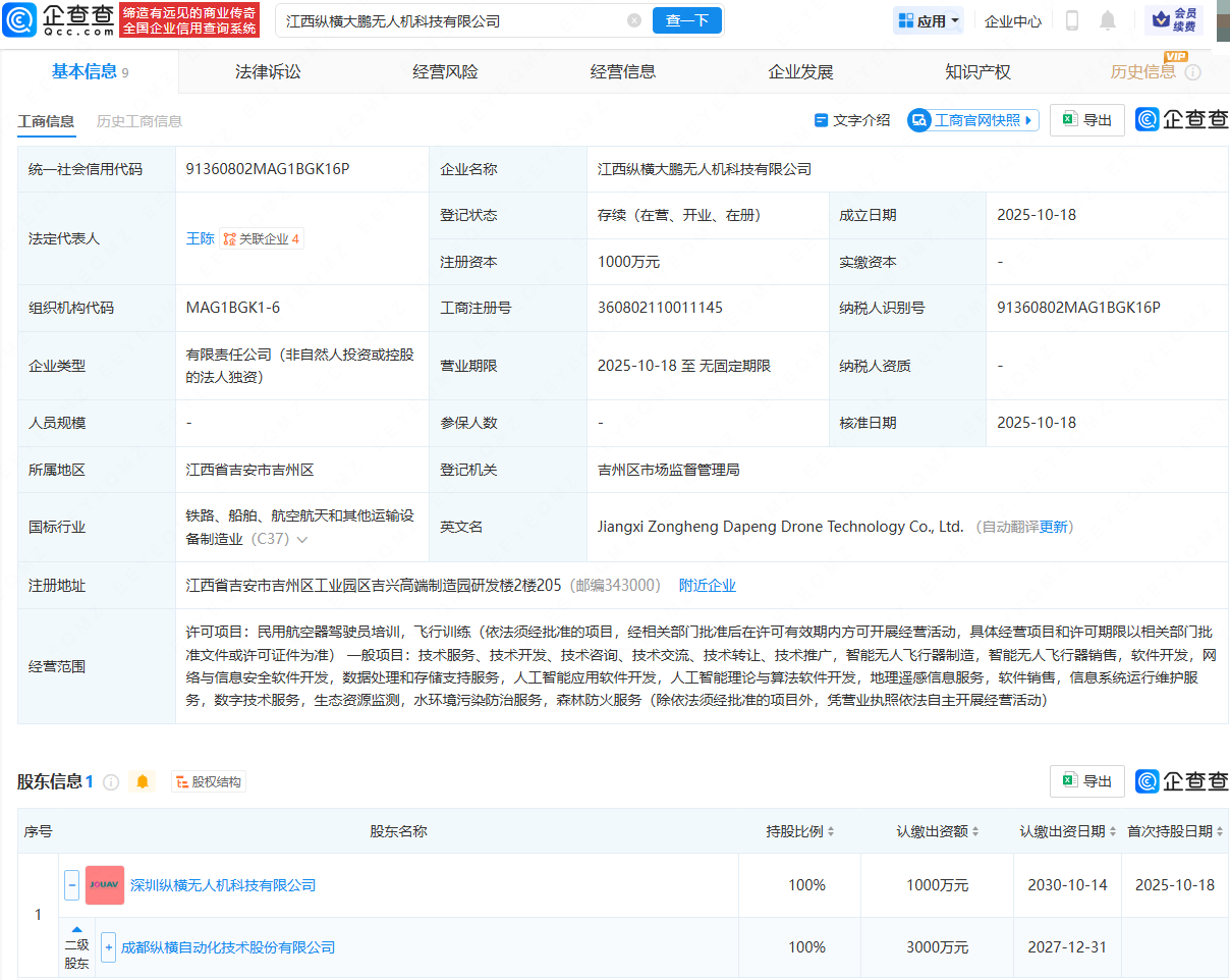 企查查APP显示,近日,江西纵横大鹏无人机科技有限公司成立,法定代表人为王陈,注册资本为1000万元,经营范围包含:民用航空器驾驶员培训,智能无人飞行器制造,智能无人飞行器销售,地理遥感信息服务等。企查查股权穿透显示,该公司由纵横股份(688070)间接全资持股。