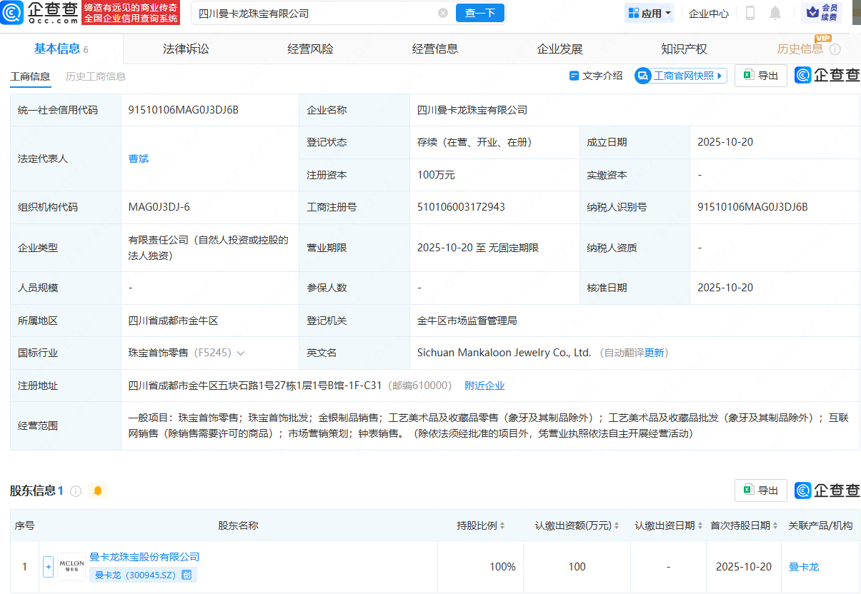 企查查APP显示,近日,四川曼卡龙珠宝有限公司成立,法定代表人为曹斌,经营范围包含:珠宝首饰零售;珠宝首饰批发;金银制品销售;工艺美术品及收藏品零售(象牙及其制品除外)等。企查查股权穿透显示,该公司由曼卡龙(300945)全资持股。