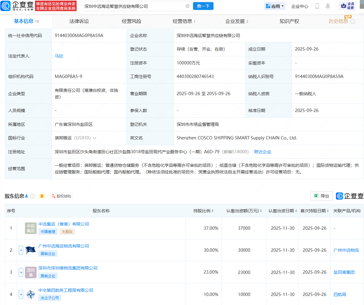 企查查APP显示,近日,深圳中远海运智慧供应链有限公司成立,法定代表人为马欣,注册资本为10亿元,经营范围包含:装卸搬运;国际货物运输代理;供应链管理服务;国际船舶代理;国内船舶代理等。企查查股权穿透显示,该公司由中远集运(香港)有限公司、广州中远海运物流有限公司等共同持股。