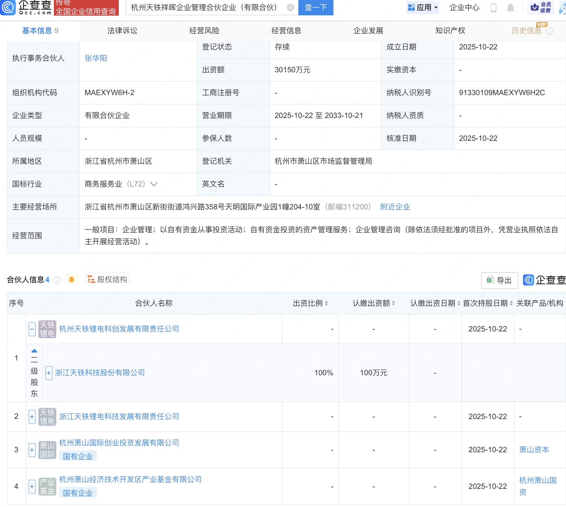 企查查APP显示,近日,杭州天铁祥晖企业管理合伙企业(有限合伙)成立,出资额约3亿元,经营范围包含:企业管理;以自有资金从事投资活动;自有资金投资的资产管理服务;企业管理咨询。企查查股权穿透显示,该企业由天铁科技(300587)全资子公司杭州天铁锂电科创发展有限责任公司等共同出资。