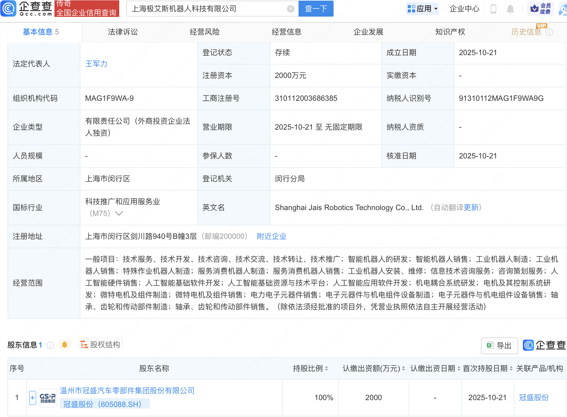 企查查APP显示,近日,上海极艾斯机器人科技有限公司成立,注册资本2000万元,经营范围包含:智能机器人的研发;智能机器人销售;人工智能硬件销售;人工智能基础软件开发;人工智能基础资源与技术平台等。企查查股权穿透显示,该公司由冠盛股份(605088)全资持股。
