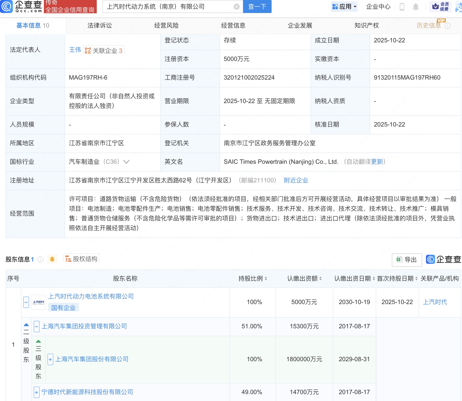企查查APP显示,近日,上汽时代动力系统(南京)有限公司成立,法定代表人为王伟,注册资本5000万人民币,经营范围包括电池制造、电池零配件生产、电池销售等。企查查股权穿透显示,该公司由上汽时代动力电池系统有限公司全资持股,后者由上汽集团(600104)全资子公司上海汽车集团投资管理有限公司、宁德时代(300750)共同持股。