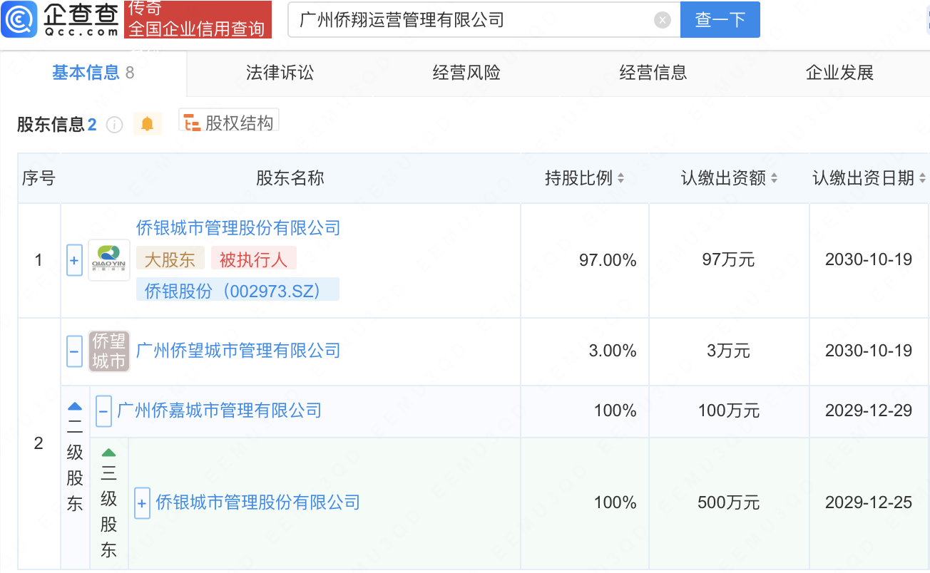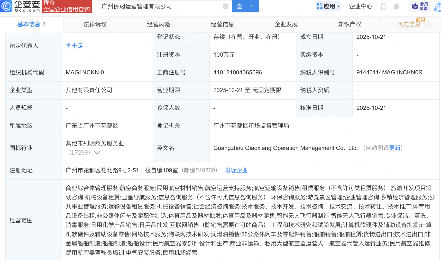 企查查APP显示,近日,广州侨翔运营管理有限公司成立,法定代表人为李丰足,经营范围包含:智能无人飞行器制造;智能无人飞行器销售;物联网技术研发;民用航空器零部件设计和生产等。企查查股权穿透显示,该公司由侨银股份(002973)间接全资持股。