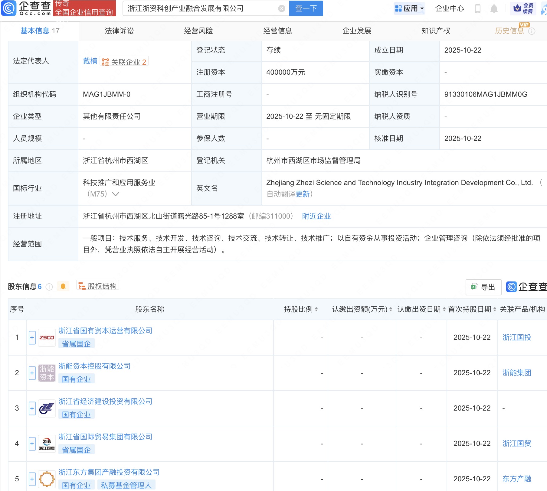 企查查APP显示,近日,浙江浙资科创产业融合发展有限公司成立,法定代表人为戴楠,注册资本40亿人民币,经营范围为技术服务、技术开发、技术咨询、技术交流、技术转让、技术推广,以自有资金从事投资活动,企业管理咨询。企查查股权穿透显示,该公司由浙江省国有资本运营有限公司、浙能资本控股有限公司、浙江省经济建设投资有限公司、浙江省国际贸易集团有限公司等共同持股。