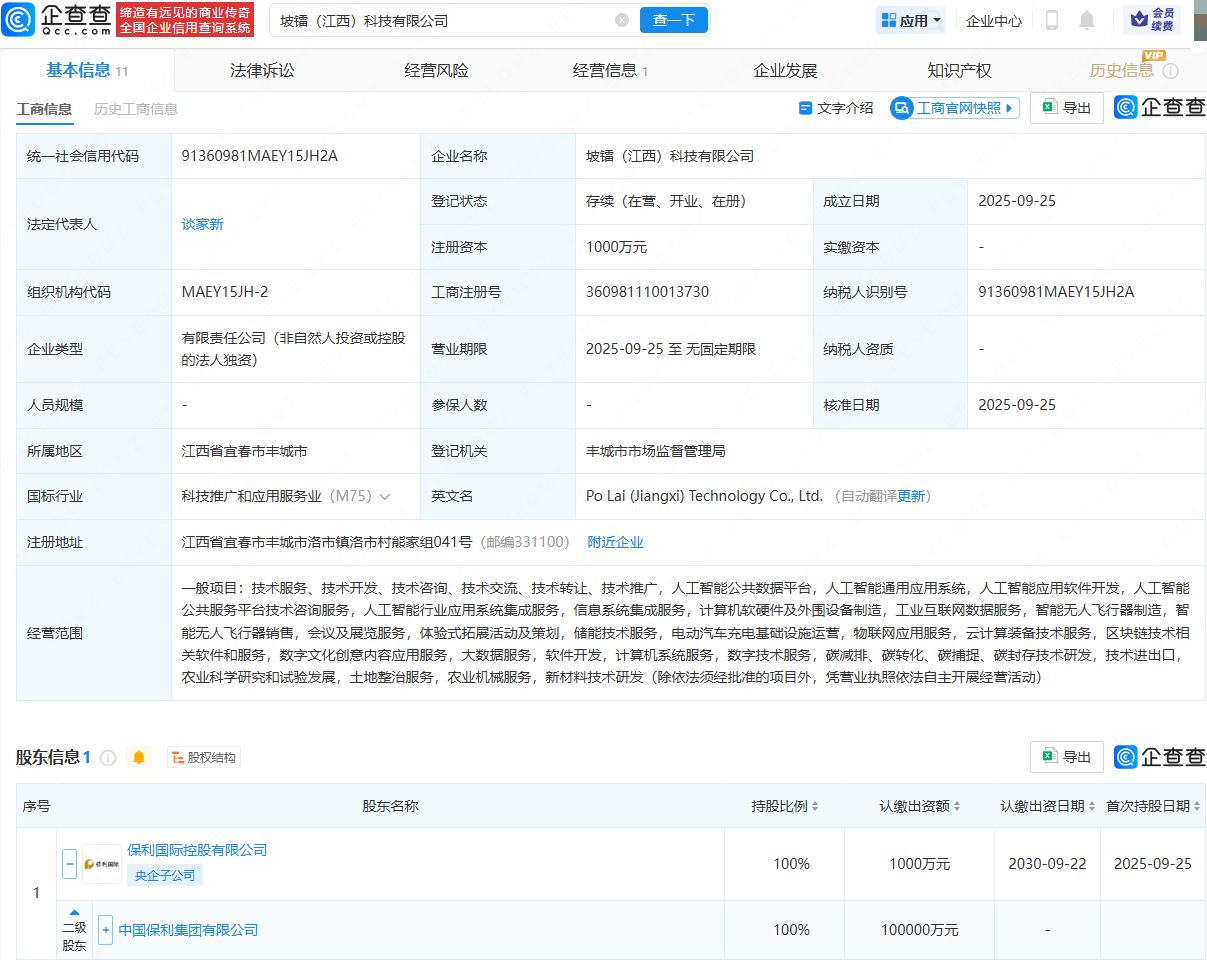 企查查APP显示,近日,坡镭(江西)科技有限公司成立,法定代表人为谈家新,注册资本为1000万元,经营范围包含:人工智能公共数据平台,人工智能通用应用系统,人工智能应用软件开发,智能无人飞行器制造等。企查查股权穿透显示,该公司由中国保利集团有限公司间接全资持股。