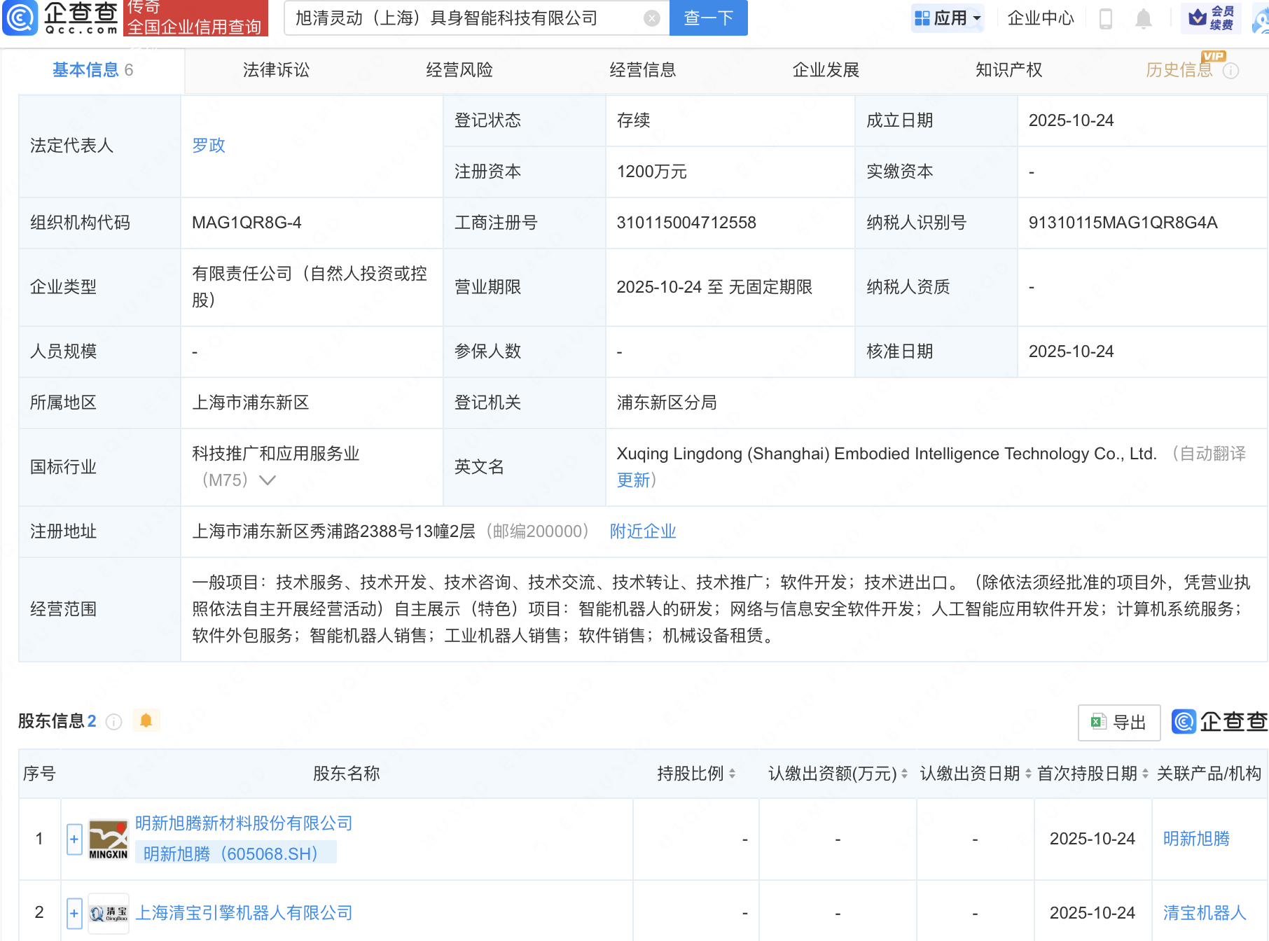 企查查APP显示,近日,旭清灵动(上海)具身智能科技有限公司成立,注册资本1200万元,经营范围包含:智能机器人的研发;网络与信息安全软件开发;人工智能应用软件开发等。企查查股权穿透显示,该公司由明新旭腾(605068)、上海清宝引擎机器人有限公司共同持股。公开信息显示,该公司将开展灵巧手制造等业务。